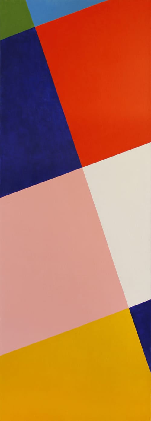 What I don’t think Westfall expected was how making wall paintings might lead back to portable paintings with a fresh eye. In “Aeolian,” “The Future Advances and Recedes” and “Delta,” he no longer relies on establishing a stable part-to-whole relationship. The diagonal orientation of the partial rectangles (or eccentric shapes) – with their edges cropped by the painting’s physical edges – breathes instability and incompleteness into the composition, almost making the work seem like a fragment. This instability is enhanced by the torque of the colored shapes, suggesting they are detached by a hair’s breadth from the picture plane. This is fresh territory, a domain that Westfall has started to define for himself. It doesn’t look back, as some of his earlier paintings did, but forward, acknowledging that disruption and dissolution are inescapable features of daily life. Nothing, we should have learned by now, is ever secure.