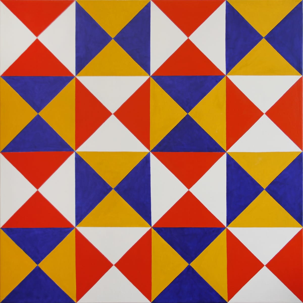 Developed by the Cosmati family during the 12th and 13th centuries, the mosaics are made of inlaid marble and glass. However, whereas tessellated floors are commonly made of similarly-sized square tiles, Cosmatesque floors are made of variously-sized triangular pieces of glass and stone against larger, geometric white marble shapes. In paintings Westfall did on the wall and on canvas that were influenced by Cosmatesque designs, his use of different-sized triangles always felt moored, despite whatever trembling and optical flicker took place within their borders.