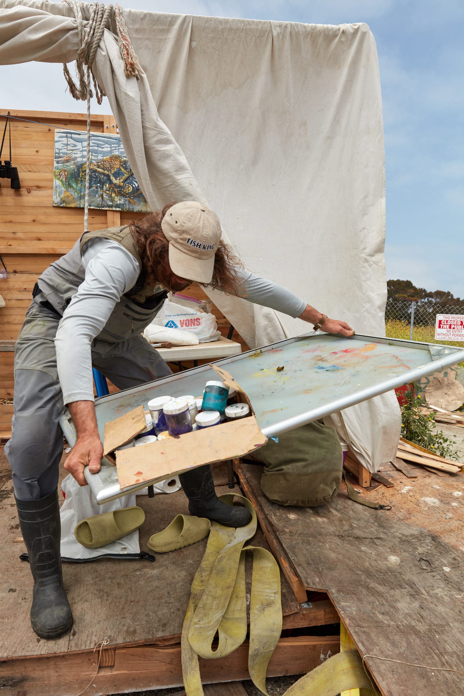 The next morning, on June 7, Wells returned to find LA County Public Works dragging his studio out of the water. Despite having been on the site at various points for over a year, including painting last spring and summer, it wasn’t until he built the raft and it resembled a home that issues were raised. He credits the complex jurisdiction with enabling him to stay under the radar for so long.