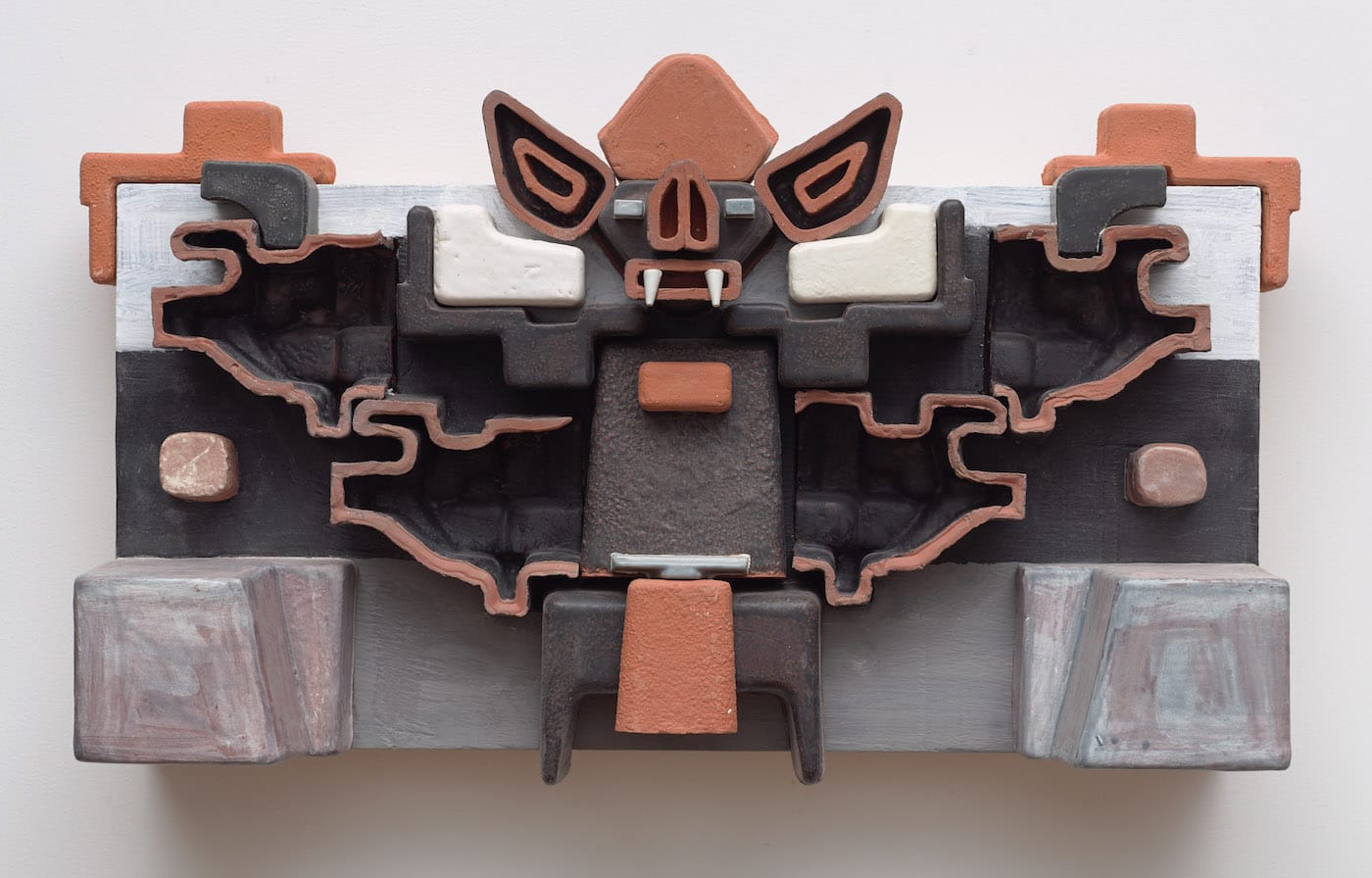 Keister makes the sculptures by fitting distinct ceramic pieces together. While Ometeotl is made of a handful of parts, “Bat III” (2015) is assembled out of dozens of pieces, each glazed a particular color, sometimes two. Again, you drift between sources and outcome, contemplating a figure that is absent anything that would soften it or make it friendlier: it is a bat and it is the other, and there is something menacing about it. One question that came up while looking at the sculpture: what does it mean to want to put a bat, its wings spread, in your house? The otherness of bats infuses them with a power that Keister makes further apparent through his use of irregular abstract forms. In their otherness, they are strange, funny, and aloof. We can neither humanize nor domesticate them, which is what makes them so quietly powerful — an energy that owes something to the Aztecs’ heavy involvement with psychoactive substances — psilocybin, peyote, and morning glory plants. They even had a word for this, monanacahuia, which means to “mushroom oneself”.