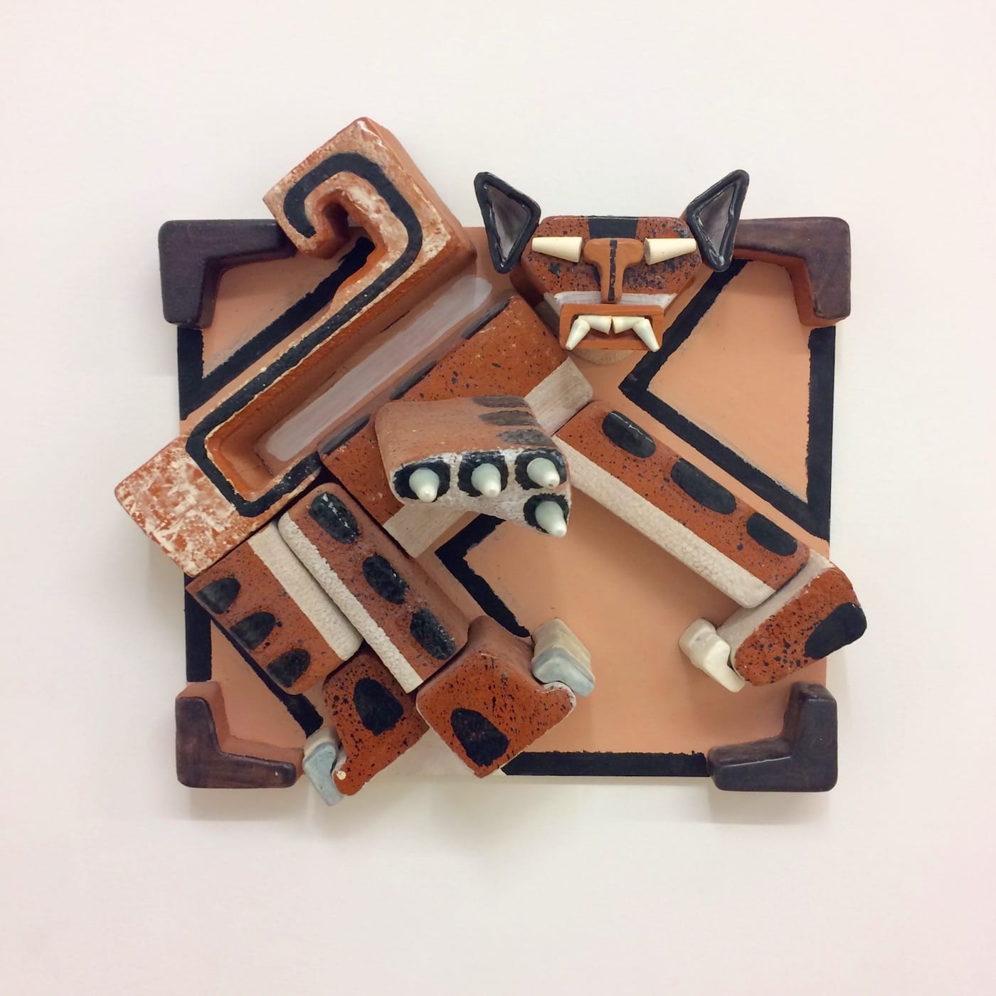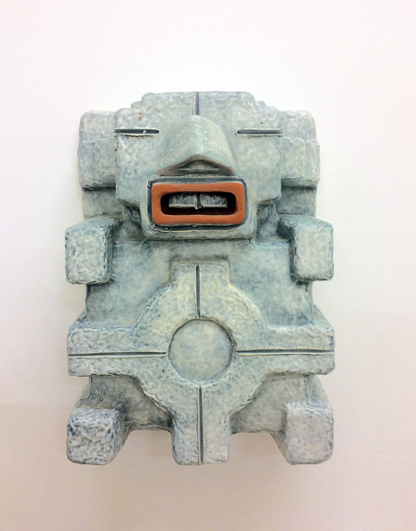 Keister’s inventiveness shines through in his use of Styrofoam – a ubiquitous, non-bio-degradable material that is poisoning the earth and seas –- as the molds for his ceramic sculptures. In “ Ometeotl” (2016), a presiding figure mounted on the wall of an alcove spanning the front of the gallery and facing into it, it is easy to see that the artist has transformed Styrofoam packaging into a squat ceramic figure with a mottled, grayish-green surface and horizontal slits for eyes. The mouth is a brown, rectangular ridge inserted into a shallow cavity in the bisected, symmetrical body. You see what the form once was as well as what it has become, a kind of double vision that is part of the pleasure “Ometeotl” offers. From the examples I have been able to find, Keister’s figure evokes but does not look at all like the Aztec images of the mythic Ometeotl. I am not sure how he does this but it is further evidence of his inventiveness.