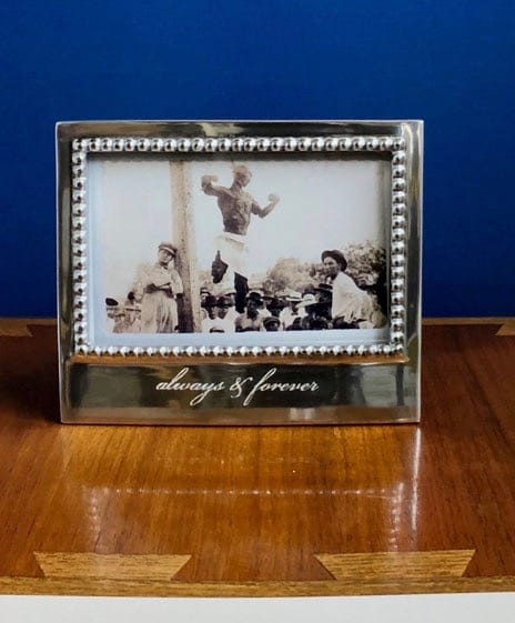 In the exhibition Family Pictures, at Yours Mine & Ours gallery Locke aestheticizes the entanglement of personal, familial, and racial histories which sits upon the mantel of every Black American home, and inconspicuously seeps into domestic realities. He also places infamous images of racial violence — lynchings, slave ships, and brutal torture — inside kitschy picture frames boasting clichéd phrases like “Memories” and “always & forever.”