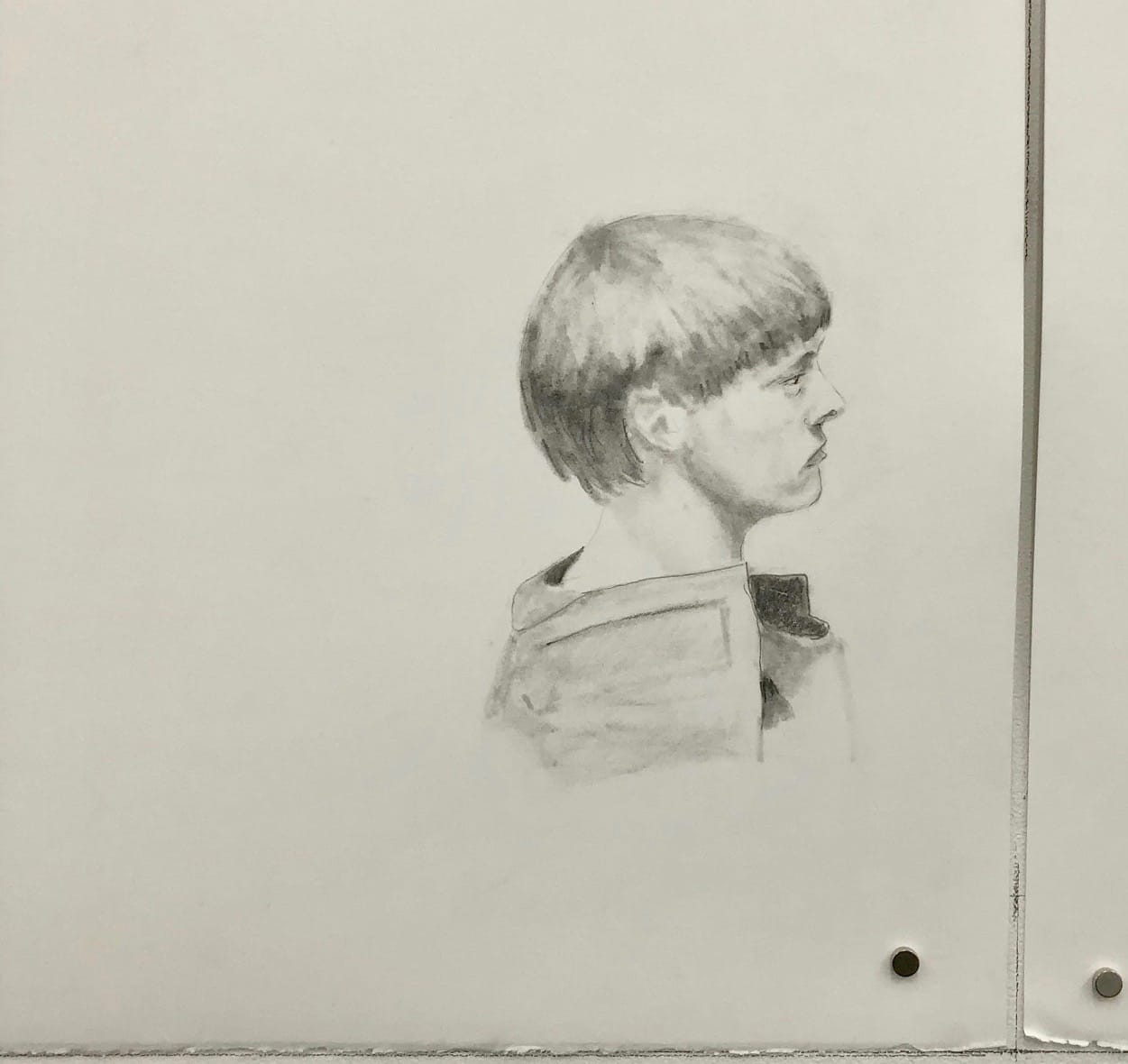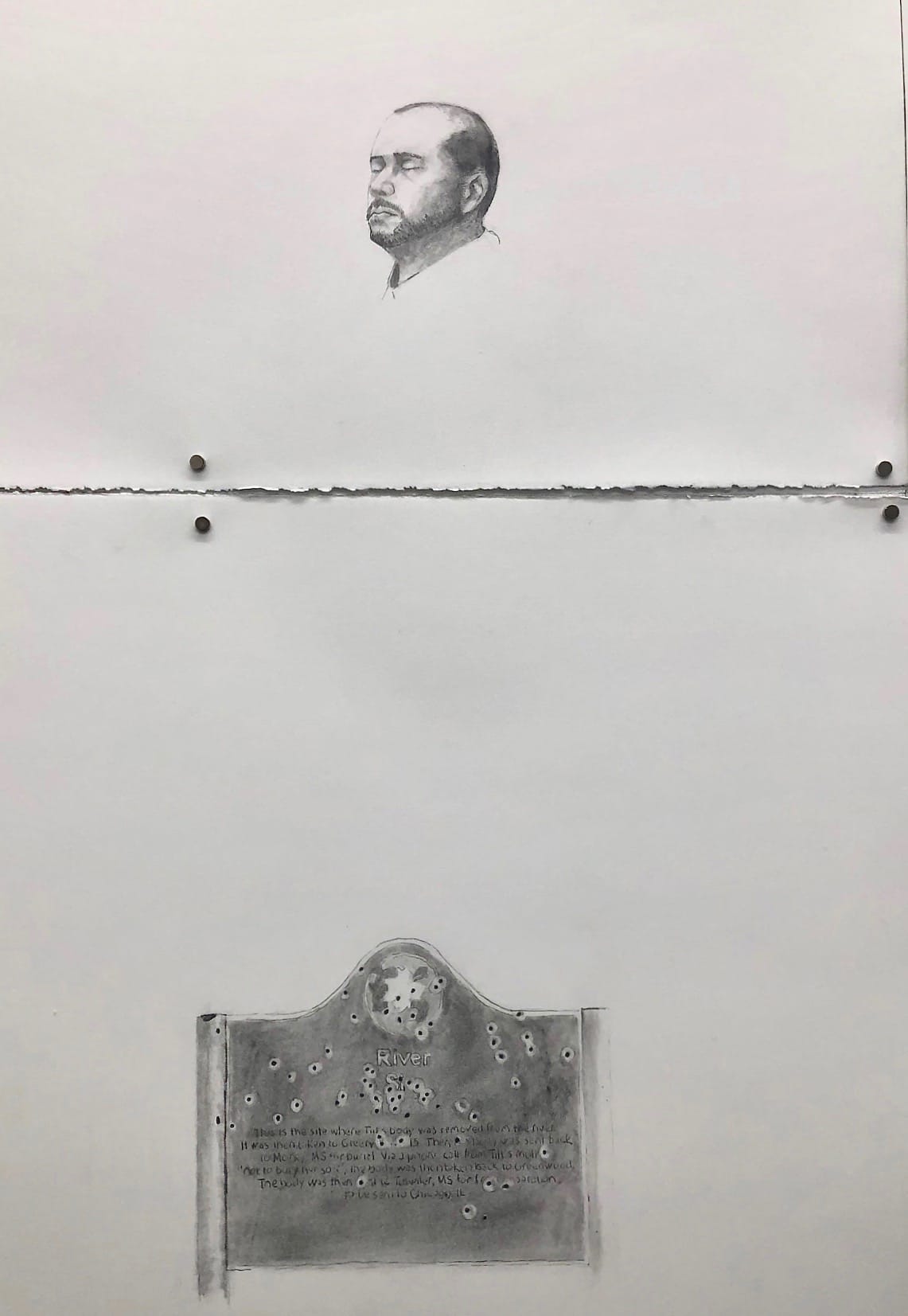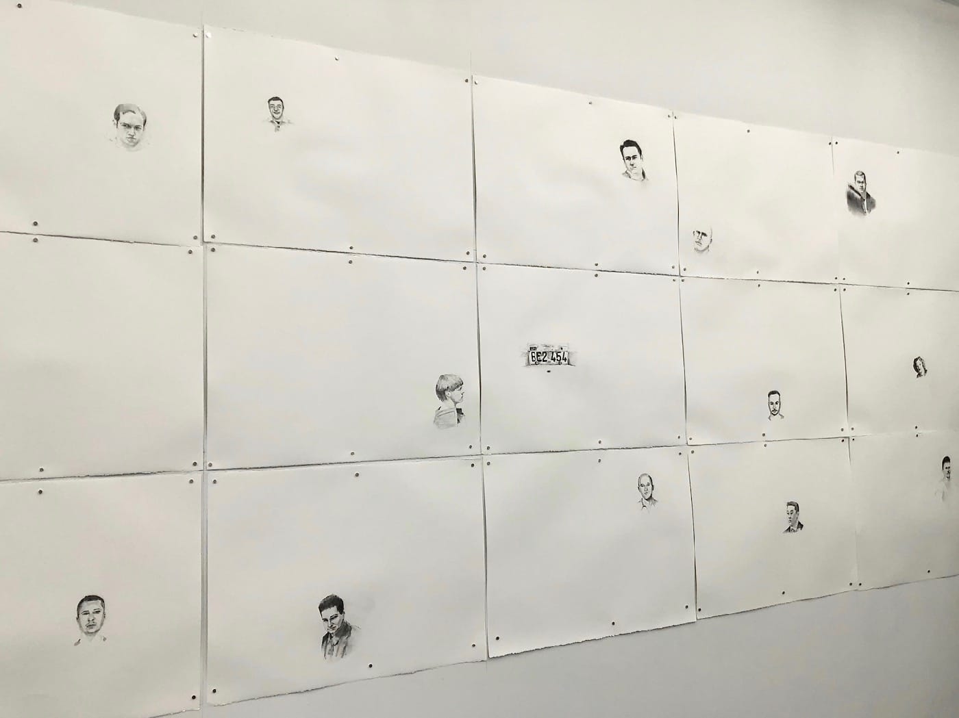 Upstairs, in #Killers, Locke explores the way these ongoing traditions of violence impact White Americans. He has sketched small, unassuming portraits in graphite on large swathes of white paper. They look miniature in comparison to their canvases, almost like a sketch made as an afterthought by a talented art student.