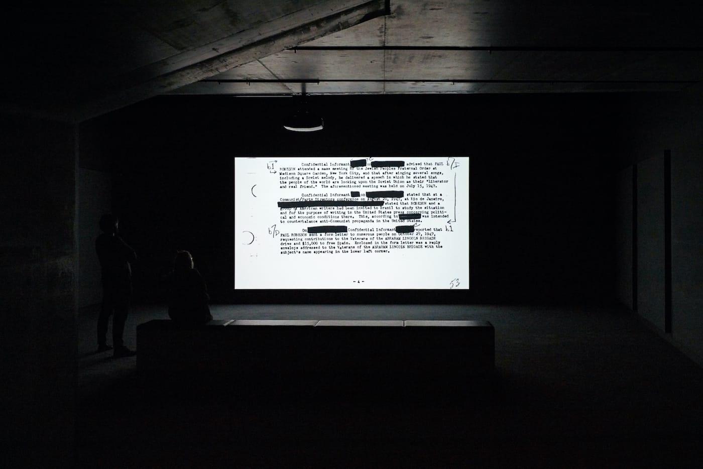 The least effective of these is End Credits (2012-ongoing), a film buzzing like a frantic fly about the subject of the singer and civil rights activist Paul Robeson (1898-1976), who was blacklisted and then put under surveillance by the FBI.