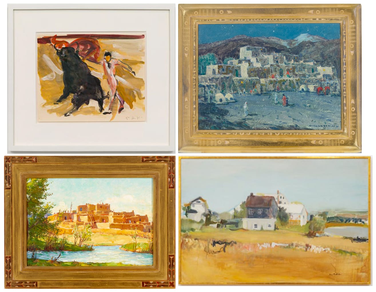 The remaining three paintings were headed to New Mexico after they were sold at a Bonhams auction in November. Joseph Henry Sharp's "View of the Taos Pueblo," Eanger Irving Couse's "Taos Pueblo at Night," and Ernest Martin Hennings's "Laguna Pueblo" fetched sale prices of $38,175, $70,935, and $20,400, respectively. Sharp, Couse, and Hennings were all founding members of the Taos Society of Artists, a short-lived collective that lasted from 1915 to 1926 whose members offered romanticized scenes of Western life, featuring subjects such as cowboys, ranches, and indigenous peoples.