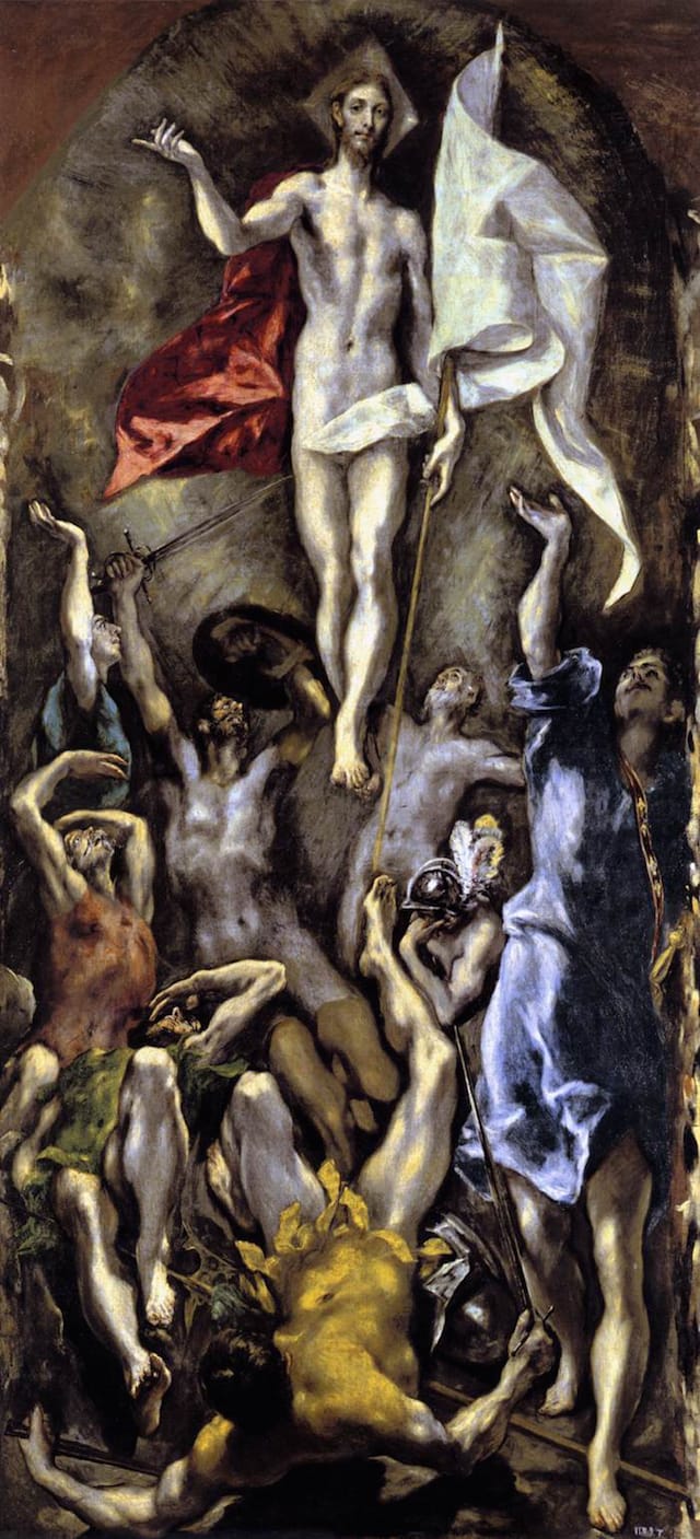 A few thoughts on how he does it. To begin with, El Greco chose a tall, narrow canvas, which lends itself to up and down motion, as opposed, for example, to Piero della Francesca’s square-format take on the same subject, which lends itself to calm. In Piero’s version, Jesus out-unblinks four uninformed, uniformed Rip Van Winkles, who’ve barely budged in centuries. The only action, a trickle of blood from the wound in Christ’s ribcage. In El Greco’s version, on the other hand, the large, compelling forms of Christ and the banners he holds float to the top, sucking toward them the legions of screaming details that make up the awestruck guards, bug-eyed and blinking, all. Well, except for the feather-helmeted one who offers a nod to Piero. Dream on, little man; we’ll get back to you later.