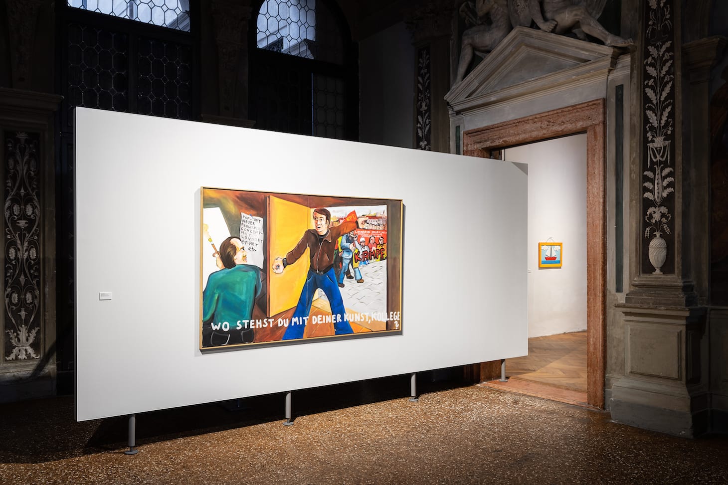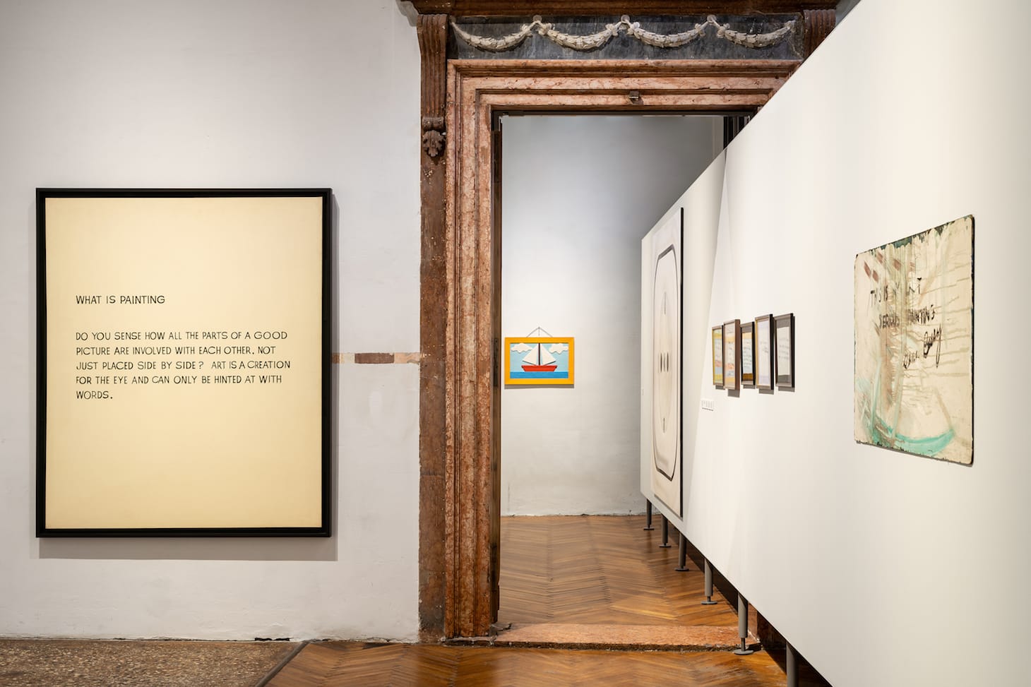 The very first work upon heading upstairs screams STOP. Josh Smith’s 2021 painting acts as the threshold between the so-called “death of painting” and its afterlife, setting the stage to consider what happens after the death of painting. Through the winding rooms of the Venetian palazzo, viewers are confronted with works by a breathtaking array of artists arranged according to themes, such as "NIENTE DA VEDERE NIENTE DA NASCONDERE” (“NOTHING TO SEE NOTHING TO HIDE”), in which artists including David Hammons and Michelangelo Pistoletto obscure the surfaces of their paintings, and “DIE HARD, STIRB LANGSAM, DURI A MORIRE,” where artists like Marcel Broodthaers, Honoré Daumier, Asger Jorn, and Kurt Schwitters deploy humor and satire to poke holes in conventional notions of authenticity and the value of painting.