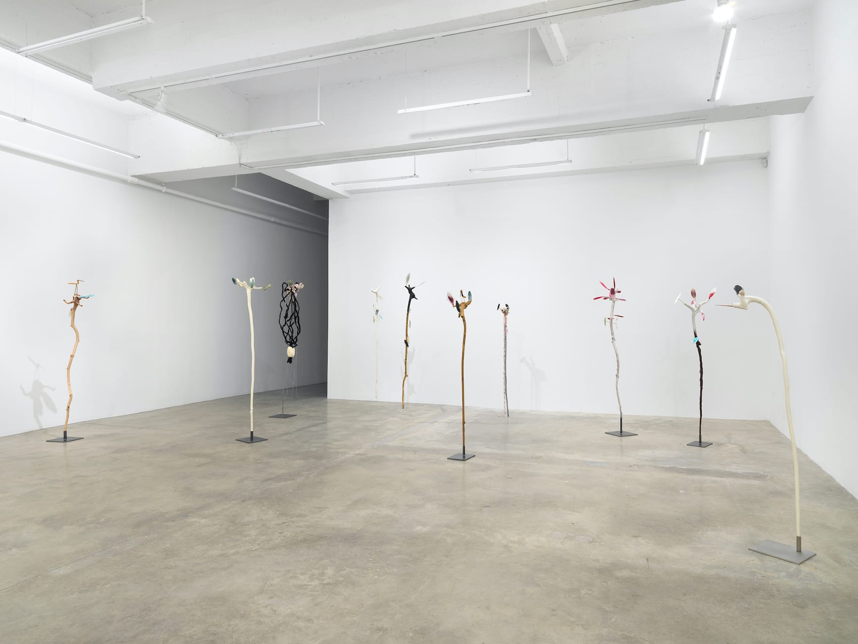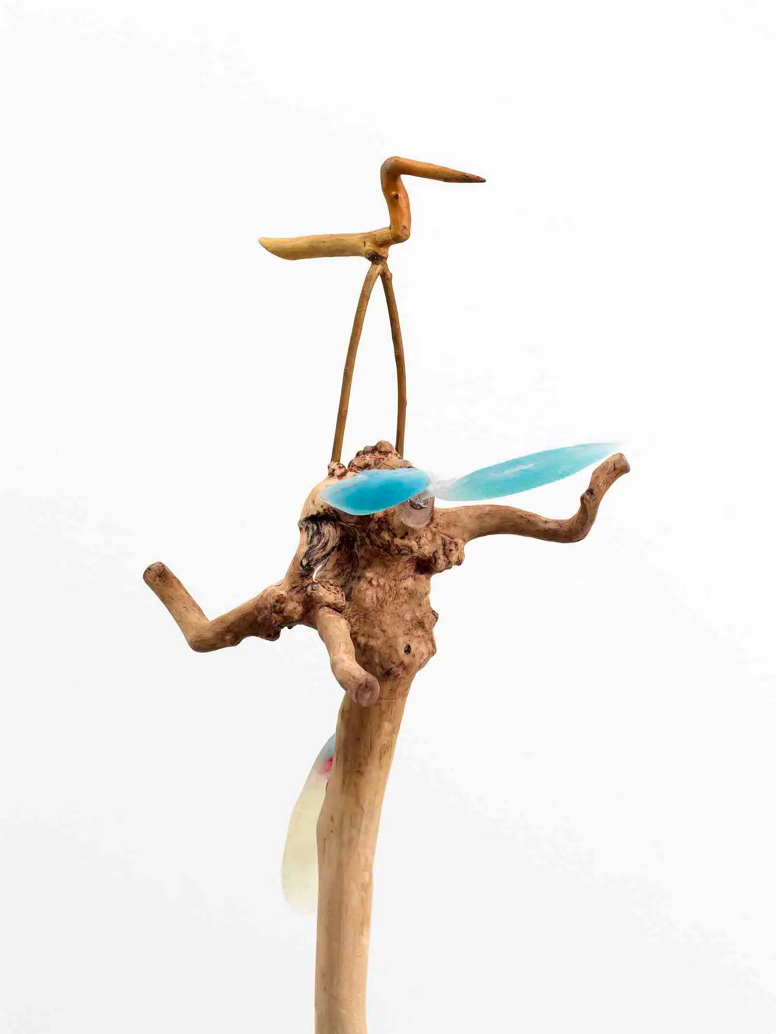 Lim, who was friends with Chai and his children, began incorporating the canes into her work by cleaning, refining, preserving, and adding to the ones she received from Chai’s family. Using cuttlefish bones and resin castings of them, hermit crab shells, glass balls, carved wooden birds (also made by Chai), polyurethane resin, metal plates, and artificial hair, Lim protects them from further decay, and creates the illusion that they are sprouting leaves. Leaf-like in shape, the cuttlefish bones introduce multiple readings into the work, including the joining of earth and ocean, domesticated parrots sharpening their beaks (for which they use the bones), and healing (they are believed to have medicinal properties).