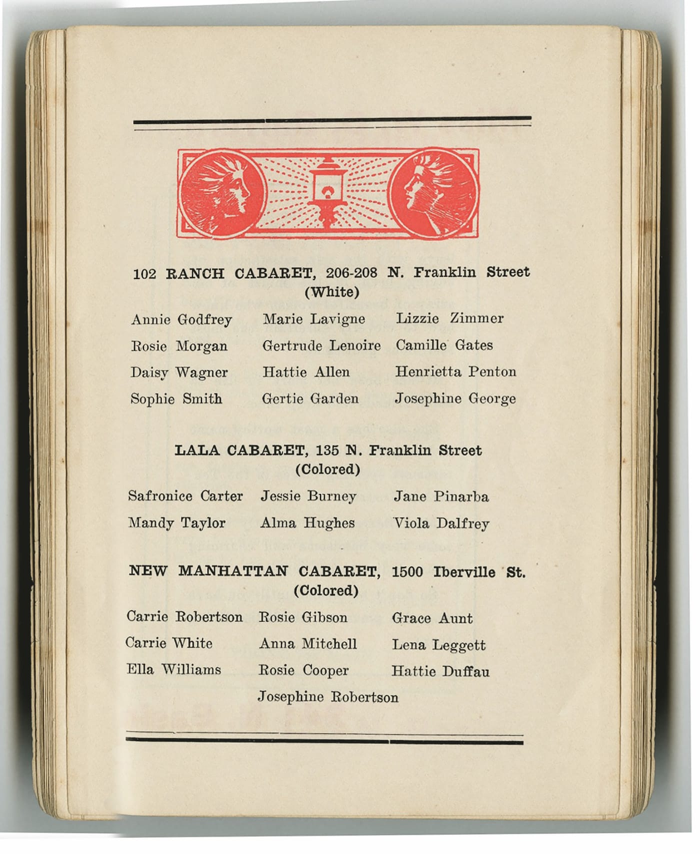 Aside from name and address, race was the only individual description offered for most women. Some brothels were segregated, others advertised their diversity. In a blue book from 1907, Madame Emma Johnson’s brothel includes this enticement:
