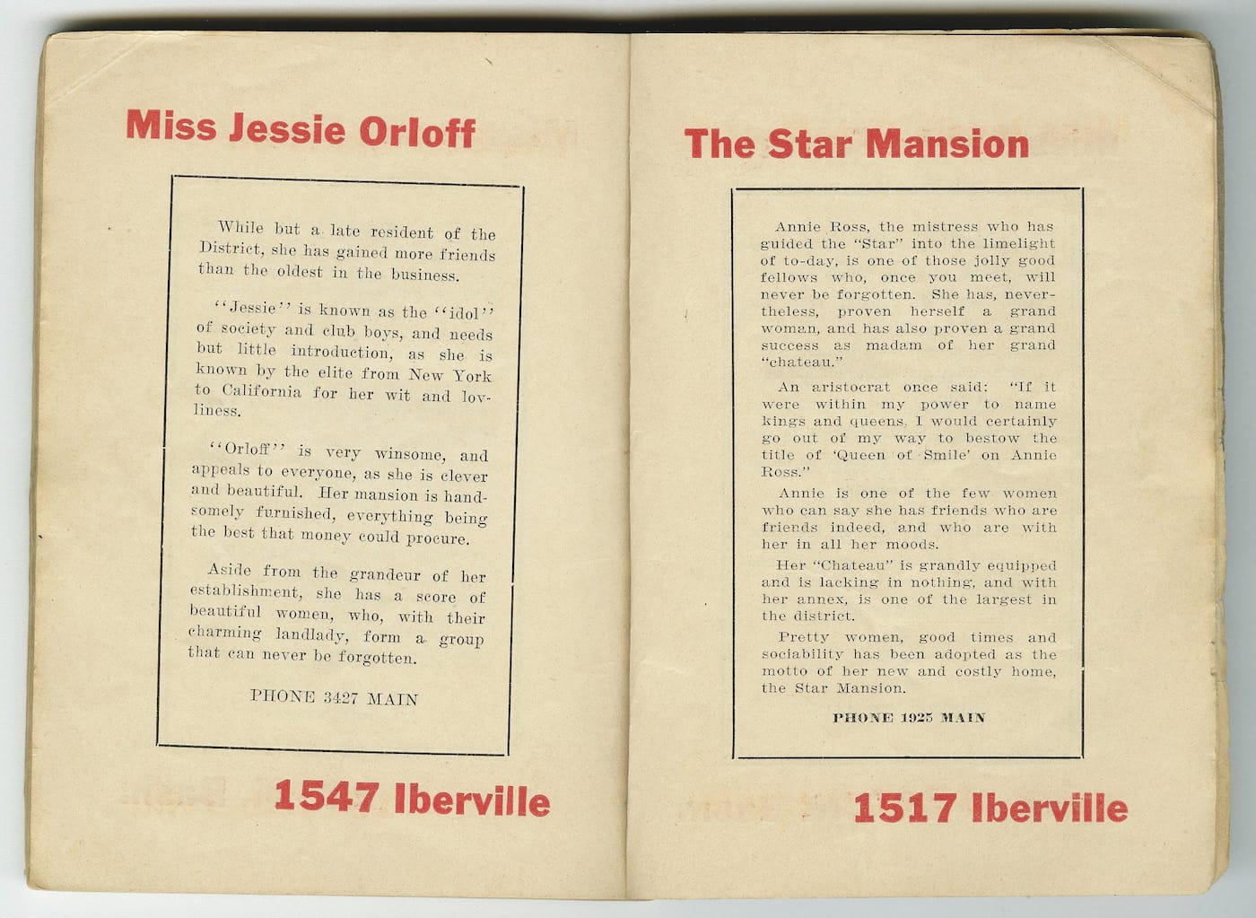 This “Tenderloin District,” as it was sometimes called, was contained between the streets of Iberville, St. Louis, North Basin, and North Robertson. It got its Storyville name from Alderman Sidney Story, who created the 1897 ordinance for an area of legalized prostitution (and wasn’t too thrilled by his titular notoriety). THNOC has digitized its early 1900s blue books, which are available to scroll through on a gallery touchscreen, and in their online catalog (search for “blue book” and click on “Bibliographic Records”). One blue book from 1908 boasts in its preface that the volume will put “the stranger on a proper grade or path as to where to go and be secure from hold-ups, brace games and other illegal practices usually worked on the unwise in Red Light Districts.” It adds that in the directory, “Names in capitals are Landladies. ‘W’ stands for white, ‘C’ for colored, ‘Oct’ for octoroon. The contents of this book are facts and not dreams from a ‘hop joint.'”