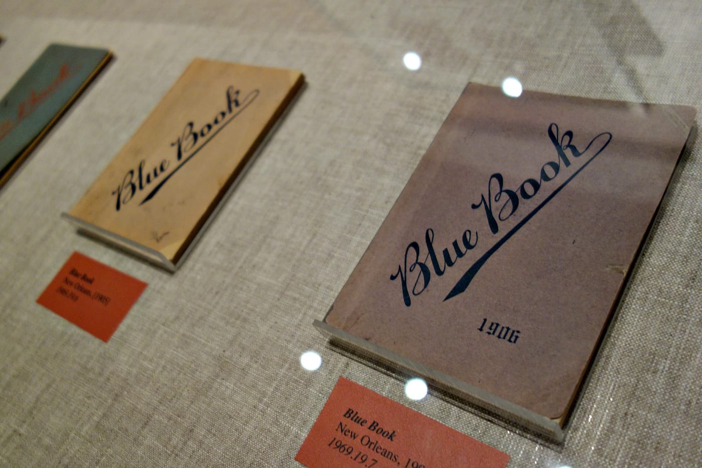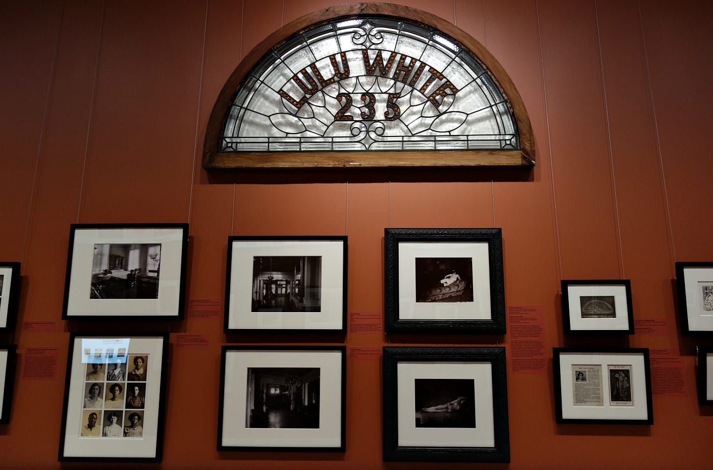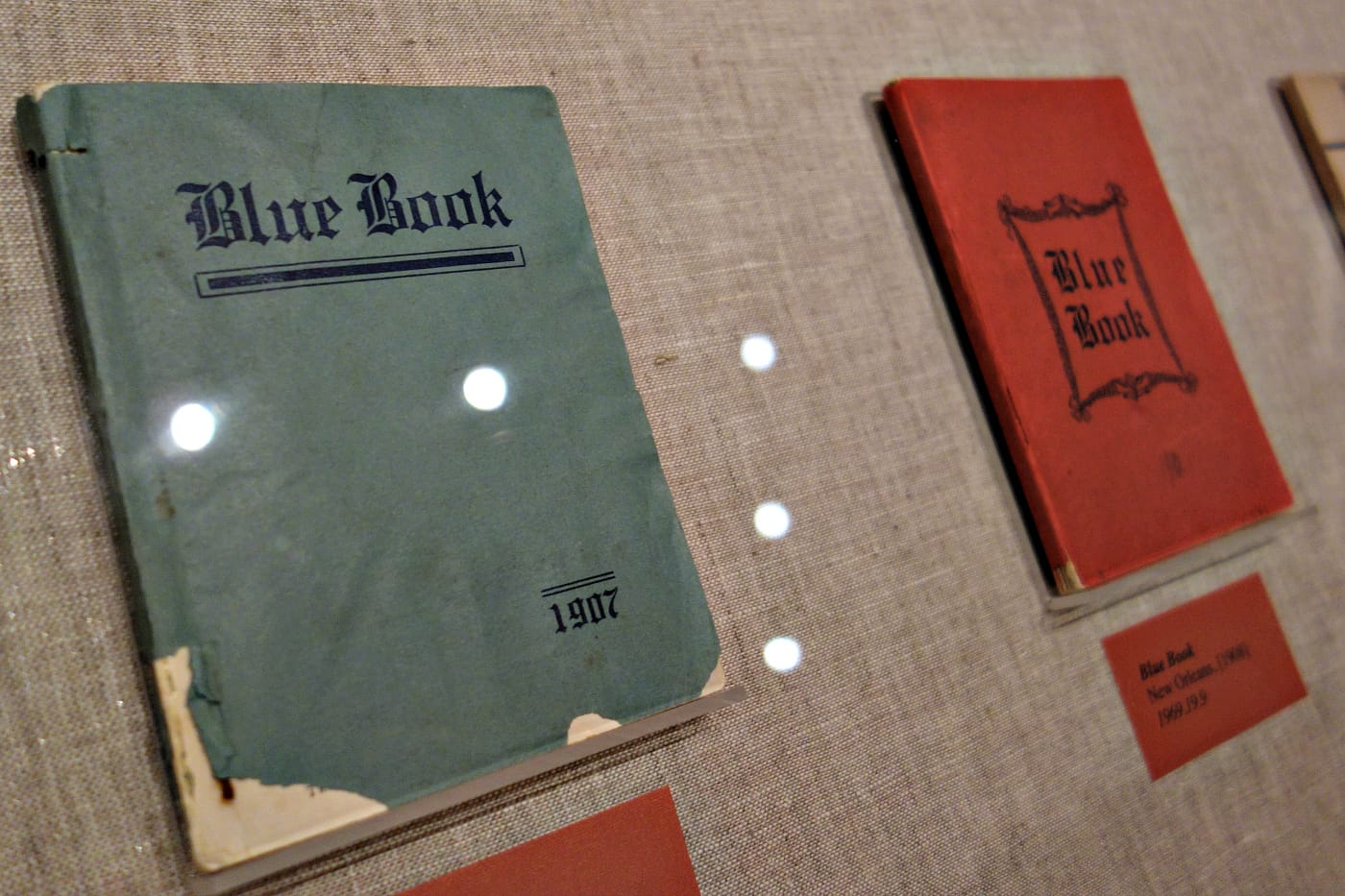 Storyville: Madams and Music, now at the Historic New Orleans Collection (THNOC), explores this complex history through photographs, maps, manuscripts, and architectural remnants, like the transom that once announced the name of madam Lulu White in red glass above the entrance to the plush Mahogany Hall. The exhibition features rare examples of the “blue books” which acted as directories for the sex workers, a display of which complements THNOC’s recent publication, Guidebooks to Sin: The Blue Books of Storyville, New Orleans. The book by Pamela D. Arceneaux, THNOC senior librarian and rare books curator, is the first contemporary study of these pocket-sized guides.