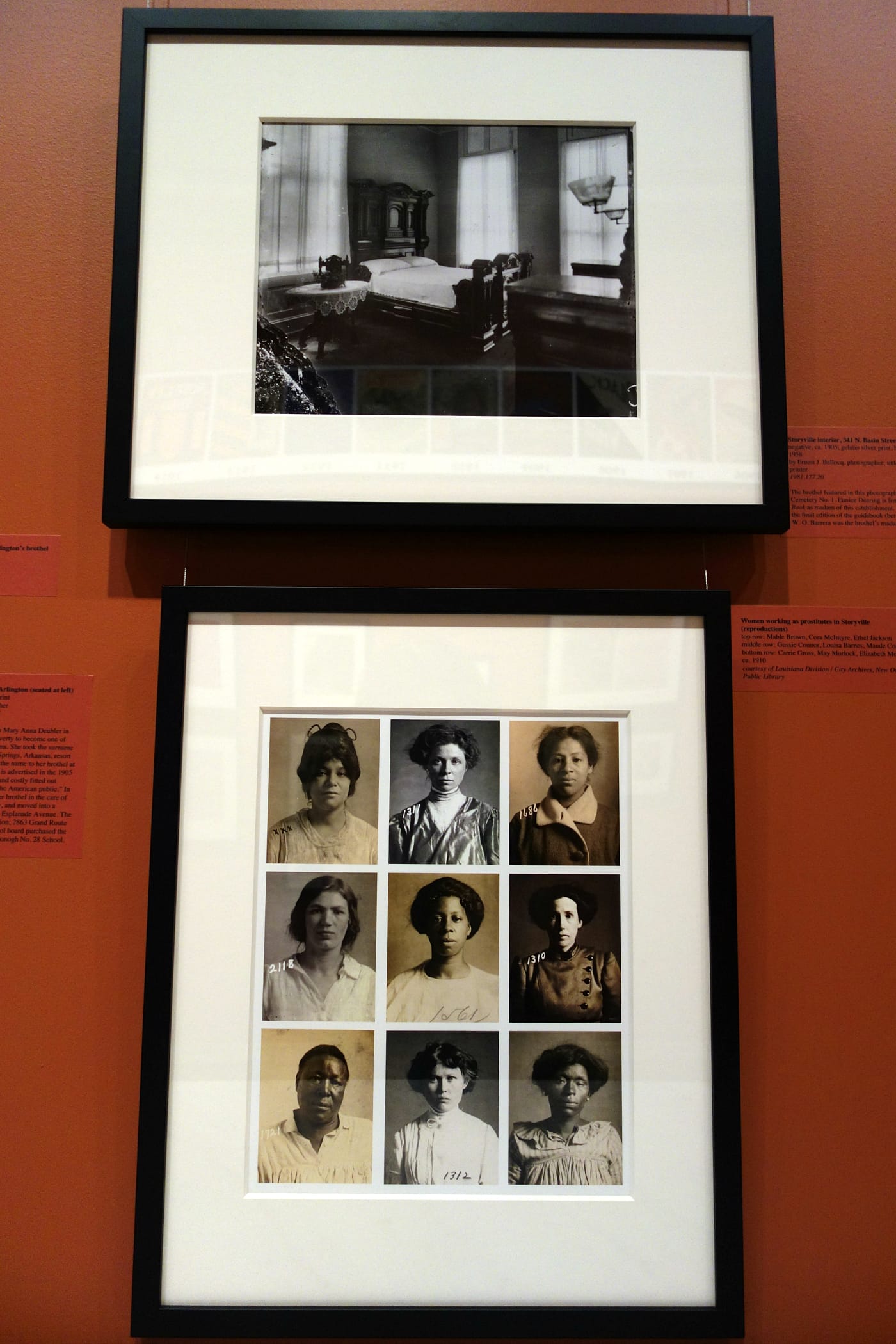 The blue books portrayed a romanticized, consumer-oriented view of Storyville generated for white men, and life for the women, especially women of color, could often be exploitative or abusive. Venereal disease was a major issue; a 1901 blue book has an advertisement for the Arlington Restaurant with “everything that is good to eat and drink with peerless and prompt service” opposite one for a drug with a “marvelous success with Gonorrhea and Gleet.” Mugshots of prostitutes from 1910 in Storyville show solemn, weathered faces, while nearby portraits by E. J. Bellocq, whose nude and clothed photographs of the Storyville women were discovered after his death, sensitively frame their bodies and brothel settings.