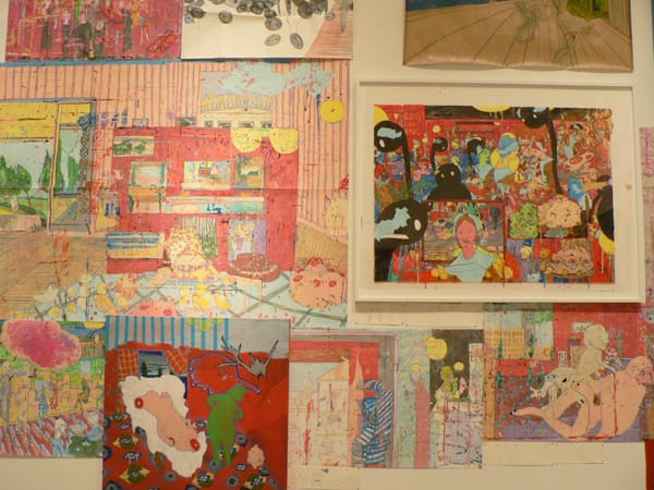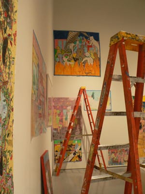 Some of her works, the more Darger-like lithographs on loan from past buyers, lean against the white gallery walls. Her most recent works, the playful perverse drawings on Mylar sheets, are spread across the floor and around the ladders and hydraulic lift in use to hang the works.