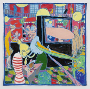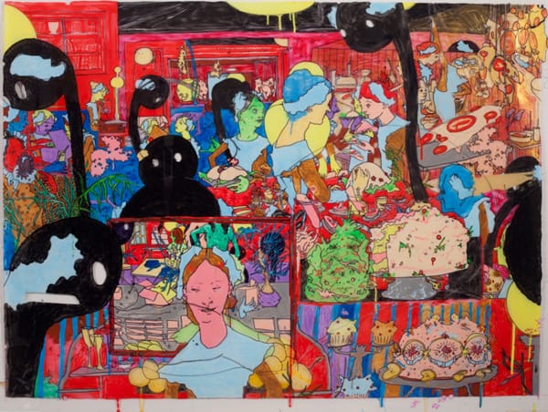 Part of it is due to the fact that the thirty-four-year-old Shishkin is doll-like petite. She’s a tiny figure in gray pleated dress shorts and matching sweater whose bobbed brunette hair barely touches the first rung of the motorized lift sitting in the middle of the gallery. Most of her disappearing act has to do with the lush colors and playfully perverse figures of her artwork; canvases of varying sizes and diverse materials (Mylar, paper, cloth) currently spread all around her as she prepares for her first solo museum show.