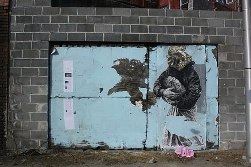His latest wheatpaste, “St. John” (2010), was recently unveiled in Baltimore’s Reservoir Hill neighborhood and is one of his most lyrical to date. When I first saw the image, I didn’t realize it would be the subject of an experiment that I’d been eager to try since first meeting Gaia back in 2008. At the time, I was interviewing him for an article I was writing, and we discussed the possibililty that street art criticism could be directly engaged with art on the street. The excitement over the idea seemed to spring from our mutual interest in exploring the limits of street-based visual dialogue. There are precedents for this type of street level critical engagement, though the existing examples are either anonymous or tongue-in-cheek — neither strategy appealed to me.