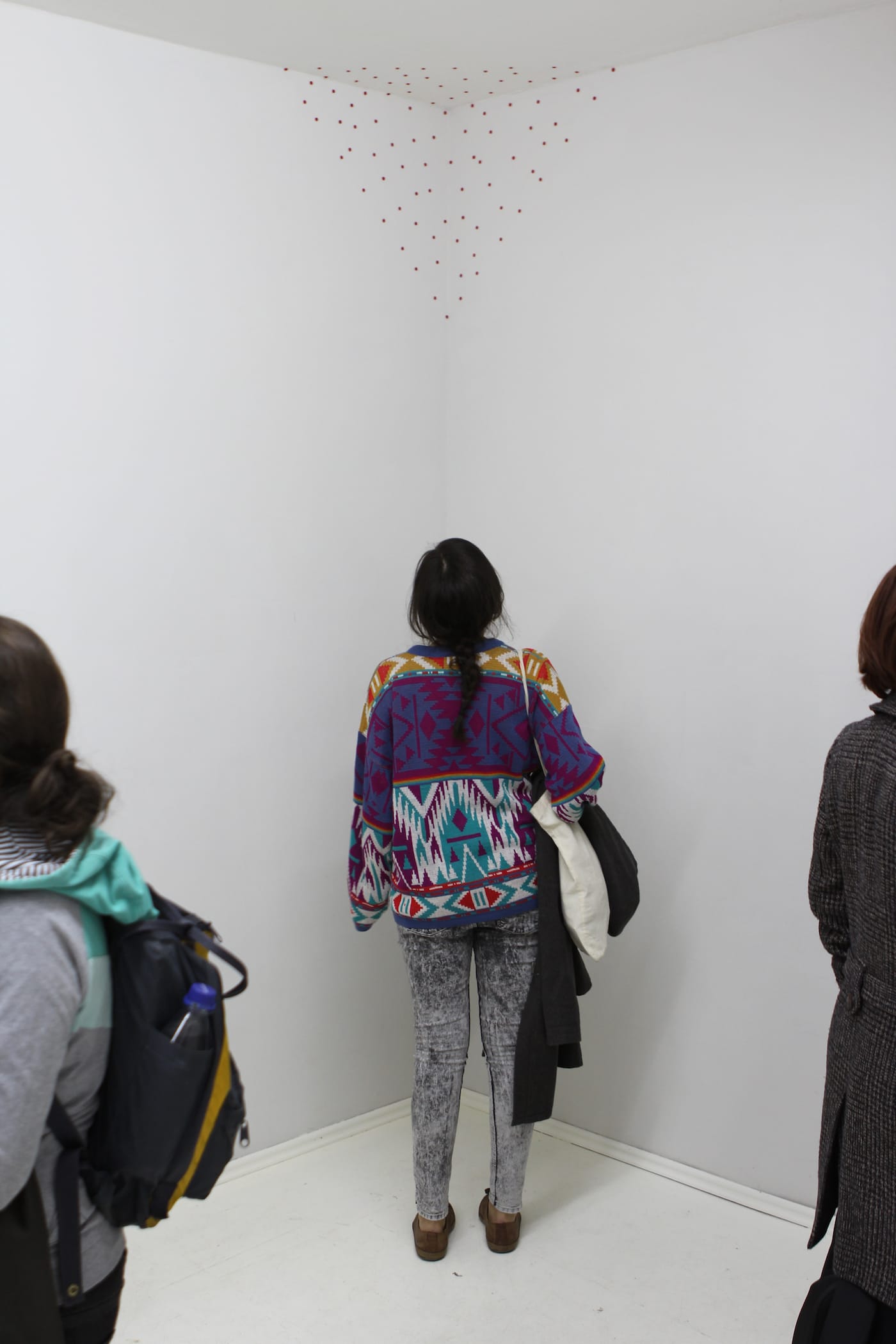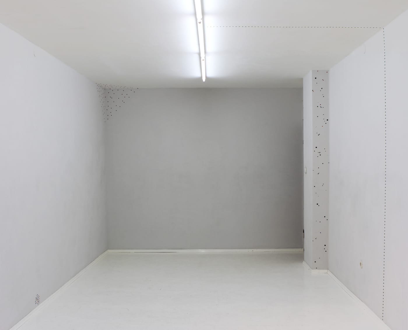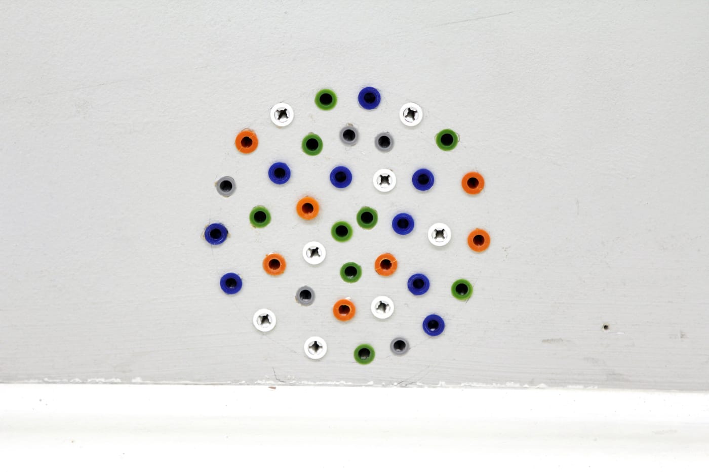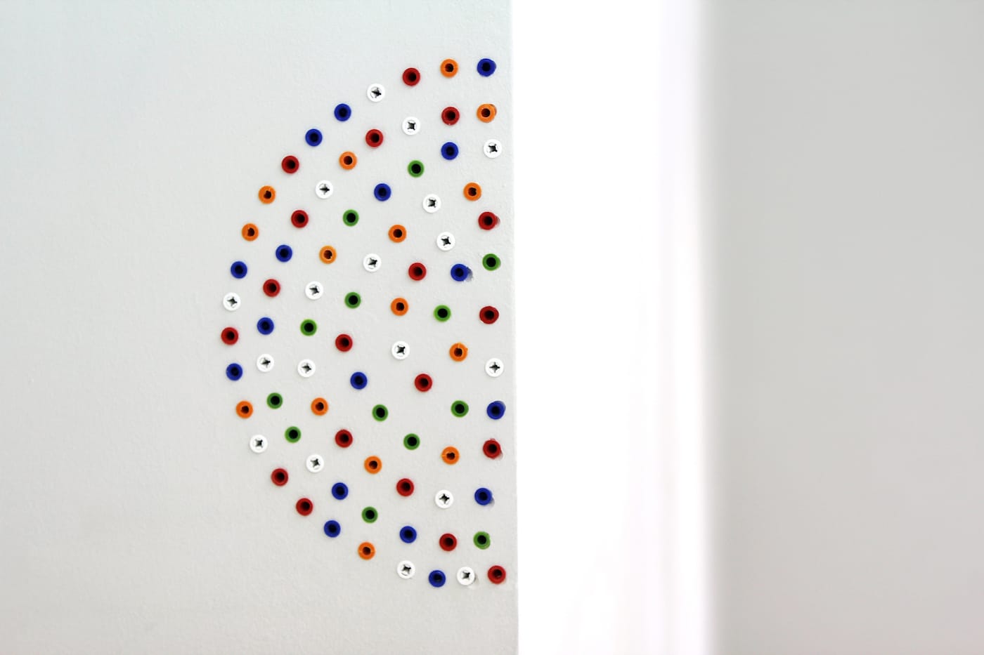 Downey, for me, represents one of the central figures within Intermural Art, with an expert understanding of both the theories and practices of Contemporary Art and the theories and practices of Street and Graffiti Art. His recent work “Inside Out, Upside Down” (2014), produced at the gallery nun in Berlin’s Neukölln district, is a particularly pertinent example. Working with everyday, commonplace wall plugs in a variety of colors and sizes, Downey created a series of unique, site-specific patterns and designs over the entirety of the gallery space. Including nothing else within the space but these simple plugs, objects normally used to install more conventional artworks (and thus remaining invisible while being crucial to the final display), he produced a minimalist, highly decorative installation, a playful intervention on and in the gallery walls.