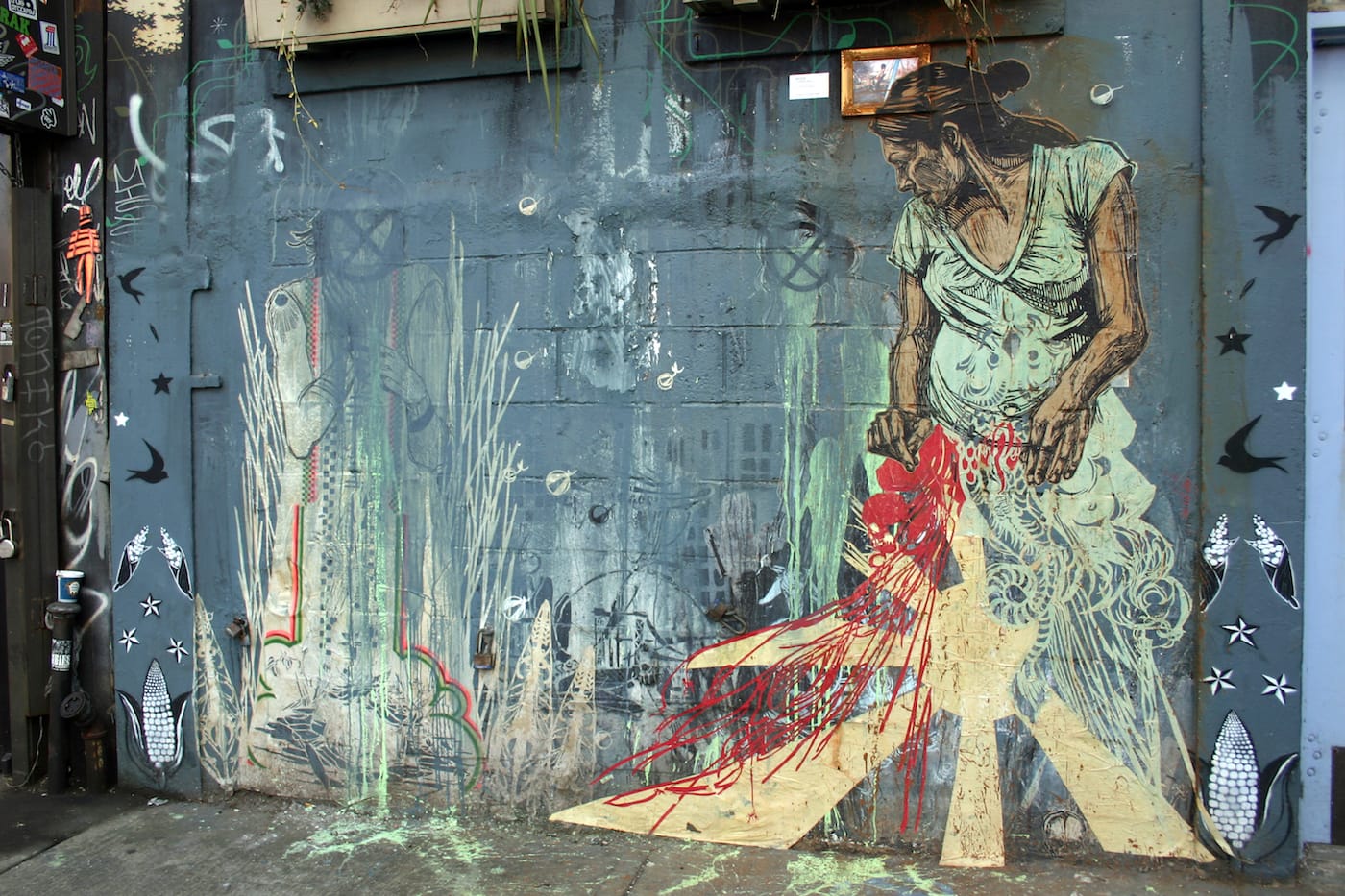 As such, much of what is called Street Art today should, in my opinion, simply be termed neo-Muralism (or even Creative City Art). Neo-Muralism is Street Art turned professional, Street Art on steroids. Entranced by the belief that bigger is always better, this “more is more,” Maximalist attitude has today come to act as the overwhelmingly dominant framing of Street Art. What’s more, alongside this neo-Muralist pursuit, Street Art has also taken a clear turn toward Kitsch. Mickey Mouse snorting cocaine and seductive female depictions. Colourful caricatures and saccharine sentiments. Surface effects and art as advertising. It is as if the utmost parody of what Street Art once was has become the norm.
