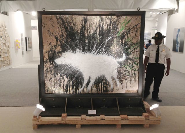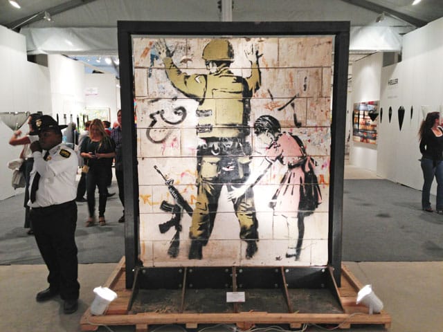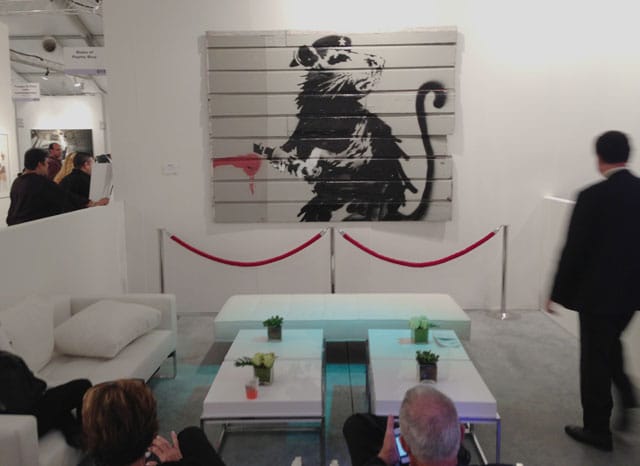 I’m finding it a little hard to feel upset at the Banksy “exhibition” that was on display in Art Miami and its sister fair CONTEXT this past week. Others have found reasons to boycott the affair, and Marc and Sara Schiller, two street art aficionados I respect, wrote on Wooster Collective that they are calling out the Miami Art Fair for letting all this happen: “Knowing that Banksy has condemned the show, they could have easily rejected the exhibition and not legitimized the stolen artwork. But they didn’t. And this tells you a lot about what their motivations are.”