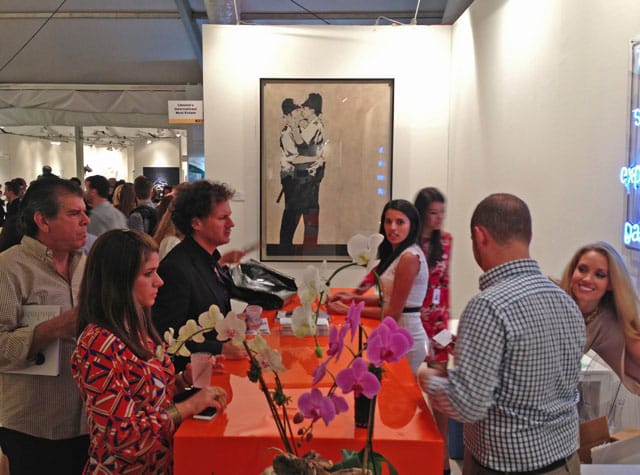 I was happy to see this show regardless of the monetary motivations of the works’ owner. Banksy’s Pest Control, a controversial committee that determines the authenticity of Banksy works on the market and refuses to authenticate any pieces not originally intended for resale, will certainly not give these their stamp of approval, but that’s alright. It’s about the art, not the auction value. I’m glad Banksy has established Pest Control to fend off profiteers, but I’m also glad I saw this small show strewn across the floor plan of two sister art fairs. Walking around to see them all felt a little like doing the stations of the cross, visiting one famous work after another, remembering the initial impact they had in their times and places. In the noise of the art fair, it was a welcome diversion, and even if the juxtapositions were often absurd, like the kissing cops near the entrance to the VIP tables and real estate agents, they reminded me how Banksy is just like any of the other artists that make up an important part of the cacophony of voices that are the contemporary art scene.