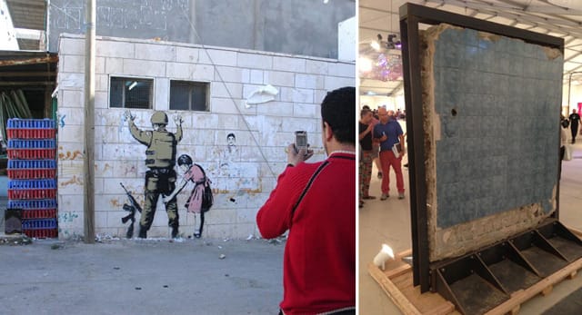 As someone who appreciates street art, I was interested in the original Banksy works, and in the case of “Stop and Search” (2007), which is from the artist’s important West Bank series, I was intrigued by the back of the mural, which was exposed and made you realize that there was a room, perhaps a store room or bathroom, on the other side of the wall. This type of display, while unfortunate, also gave the work an archival and historic feel. The display reminded me of many walls torn from archeological sites around the world. We often justify those thefts because they preserve the objects and save them from vandals, profiteers, pollution, or iconoclasts. Others have preserved Banksy’s work in other ways, like an owner of a wall Banksy “blessed” in Toronto, who chose to protect it from vandals using tightly sealed Plexiglas. In what can only be described as perfectly “Banksy,” the vandal is now being protected from other vandals, though that term “vandal” is often avoided in street art and graffiti circles since it implies criminality.