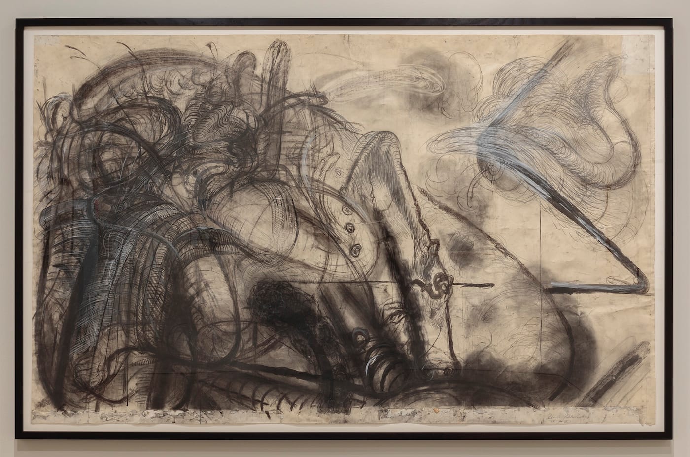 There is a large drawing in charcoal, pencil, ink brush, and opaque white by Antonius Höckelmann, who was born in Oelde, Germany, in 1937 and would have been a young child when the Third Reich collapsed. Titled “Orgie I” (1967-68), it’s a tangle of dark, writhing lines and masses, suggesting a pile of flesh redolent of self-absorption and animal instinct, the disconnect within physical connection.