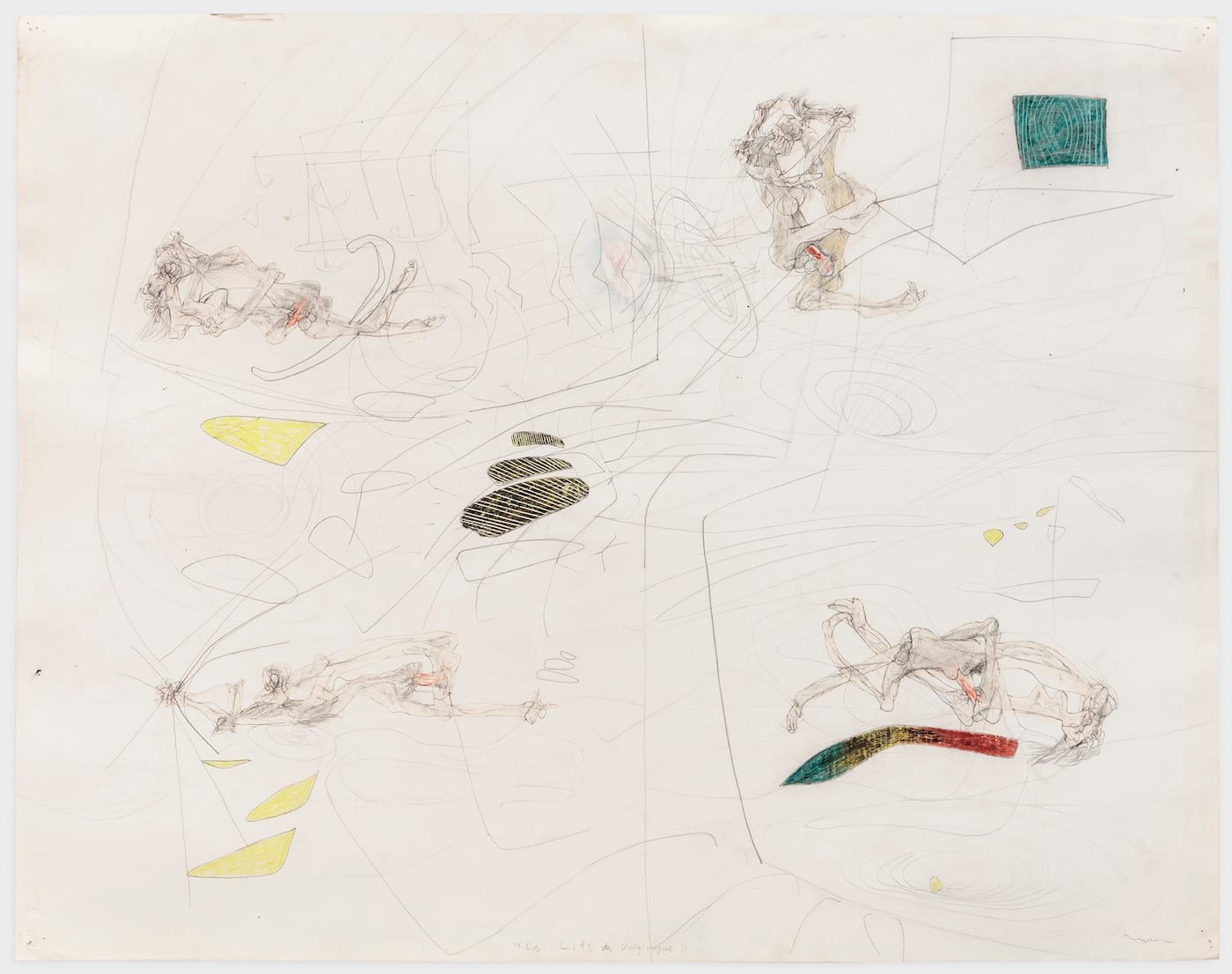 A similar struggle is occurring in Roberto Matta’s “Les Lits des Vulgivagues” (“The Beds of the Prostitutes,” 1943), a scraggly drawing in graphite and colored crayon, of four naked, intertwined, Picassoid couples in each of the paper’s quadrants, their grinding pelvises joined together, like pipe fittings, by a red, oversized erection. It’s one of the most violent images in the show.