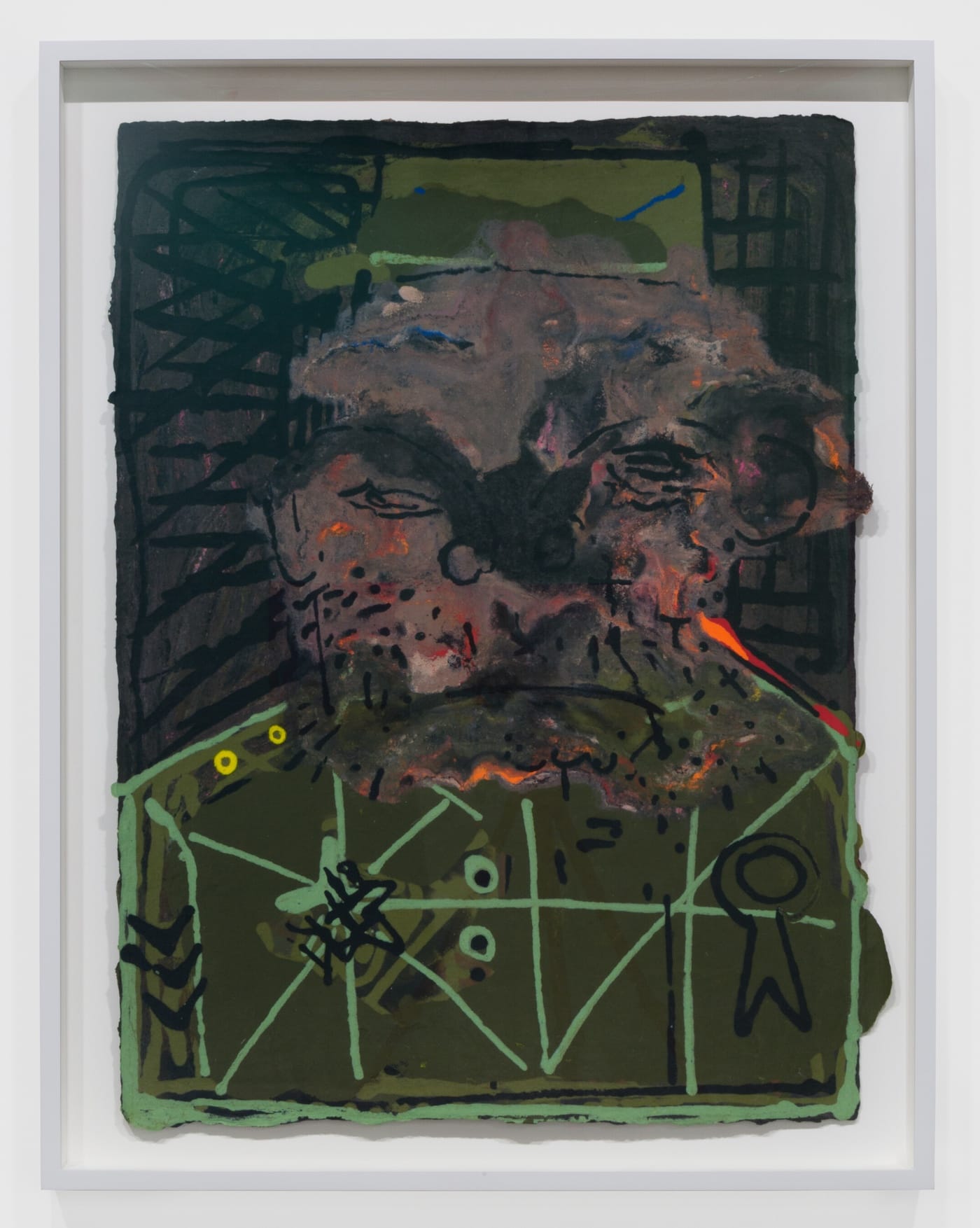 “Military Poster” (2018) is an expressionistic paper-pulp portrait of an army officer by Nicole Eisenman, whose work seems to be taking off in a dozen different directions. With his bristly beard, khaki green uniform, field cap, shoulder stripes, and medals, he could possibly be Fidel Castro, which would make the work a distinct counterpart to Peter Saul’s Stalin on the opposite wall. Any reading is possible since, as with Saul’s painting, there are no interpretive clues sprinkled about.