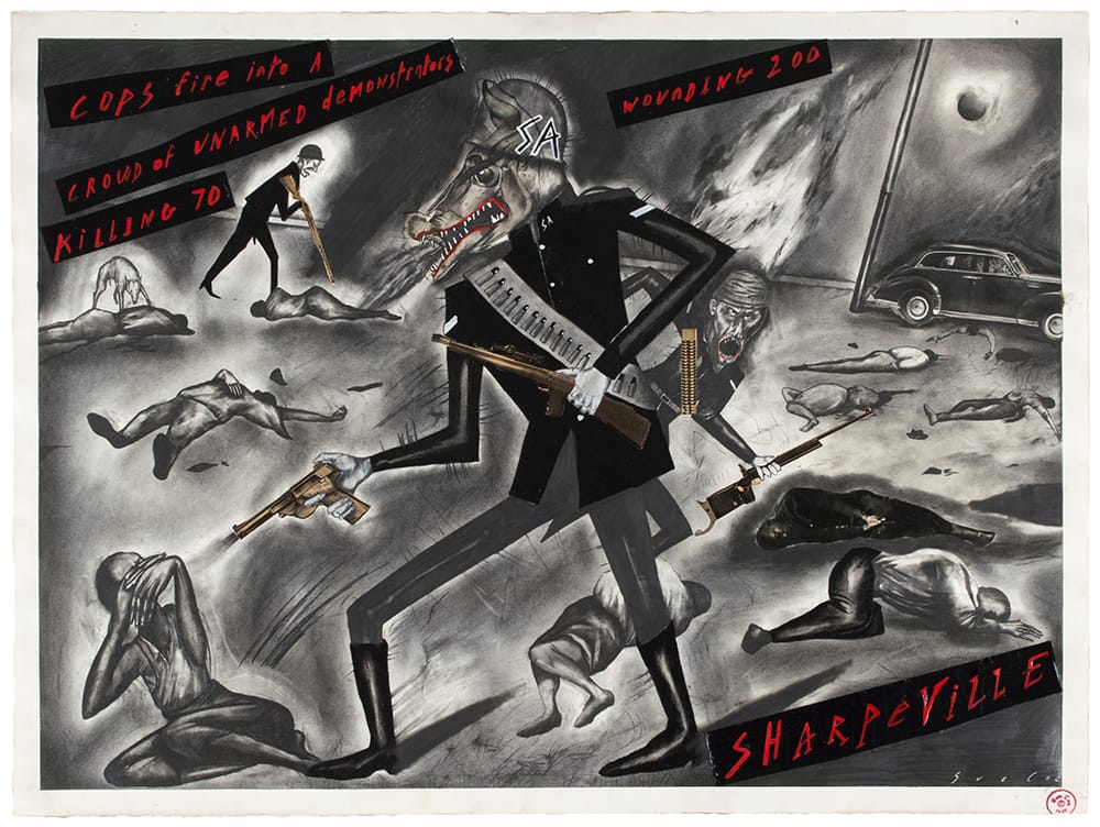 When Coe made the drawing, the Sharpeville Massacre was more than two decades in the past, and the demise of Apartheid was still 10 years off; handwritten red letters on black banners across the top of the sheet read, “Cops fire into a crowd of unarmed demonstrators, killing 70, wounding 200.” Bloodshed would continue throughout the campaign for equality, which had begun with the founding of the African National Congress in 1912.