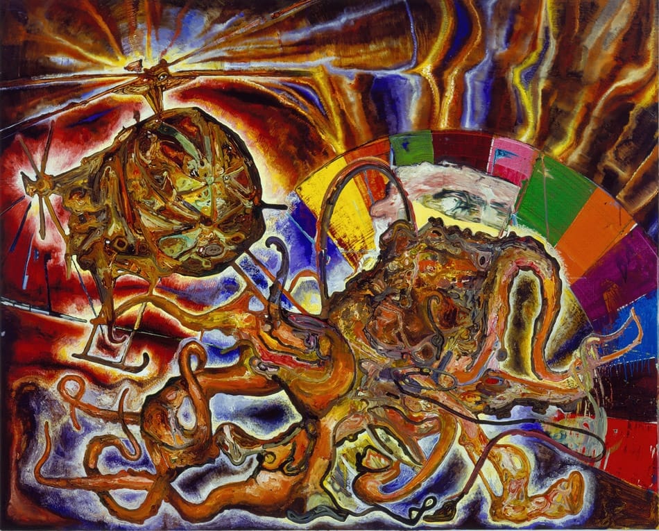 Steve DiBenedetto’s “Breakup” (2003-04), hanging next to “Military Poster,” also bounces off Saul’s picture, but as a rival for the juiciest color in the show. The paint is applied in just about every way — scraped, scrubbed, daubed, squiggled, swiped, brushed, and heaped — creating a dizzying, kaleidoscopic effect that accentuates the swirling imagery: rotating helicopter blades squaring off against coiling tentacles. These motifs, which were frequently deployed by DiBenedetto in the mid-2000s as the Iraq War was escalating, serve as abstracted, ambiguous metaphors suggesting intractable military quagmires and downward spirals of violence.