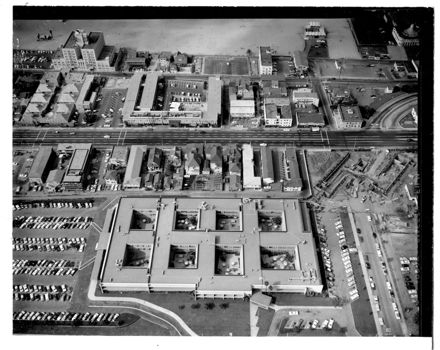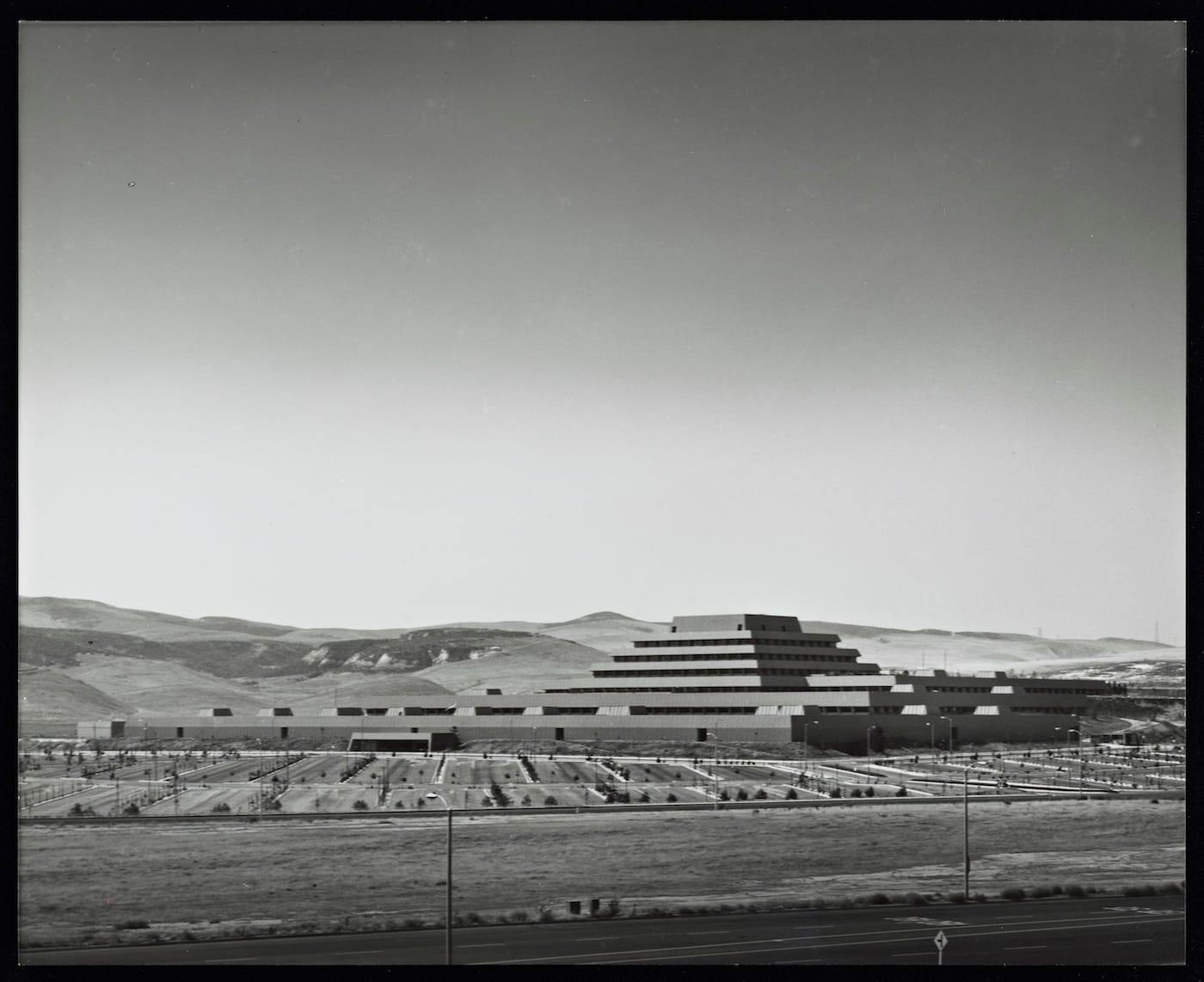 Notable examples of these modern, defense-industry compounds in the heart of idyllic Southern California include the RAND Corporation’s “waffle building” in Santa Monica, designed by architect H. Roy Kelley. Labelled by Leslie as “perhaps the ultimate Cold War think tank,” RAND exerted a major influence on US military policy, and was satirized in the 1964 film Dr. Strangelove as the Bland Corporation. Also significant is the Laguna Nigel headquarters for aerospace and defense contractor North American Rockwell, a million-square-foot, ziggurat-style structure designed by William Pereira. Although Rockwell never occupied the building, it was taken over by the General Services Administration, and the land around it became home to one of the largest planned communities in Southern California, according to Leslie.