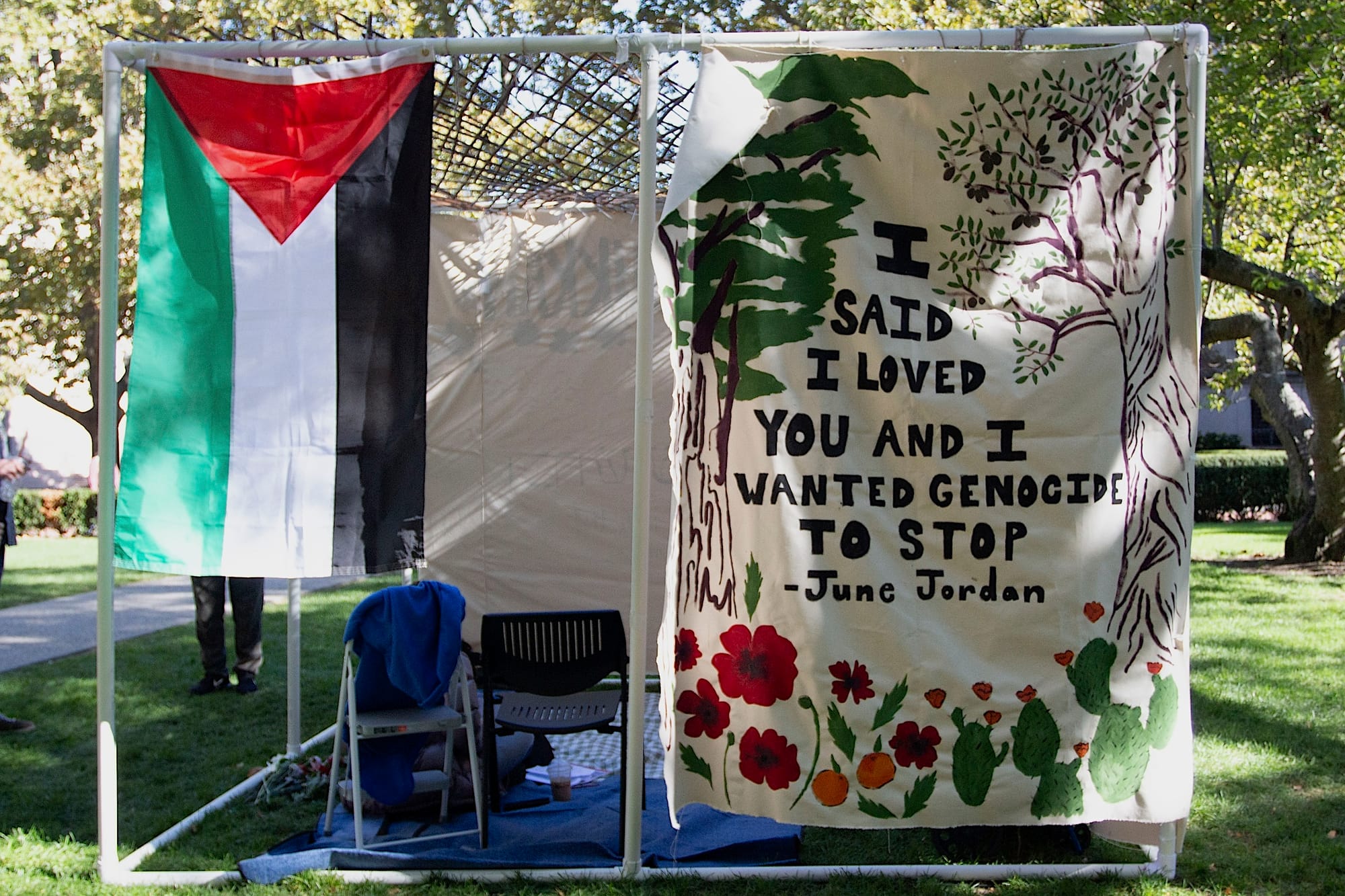The final side of the sukkah presented a quote from poet June Jordan — "I said I loved you and I wanted genocide to stop" — framed by olive trees hand-painted by the students.
