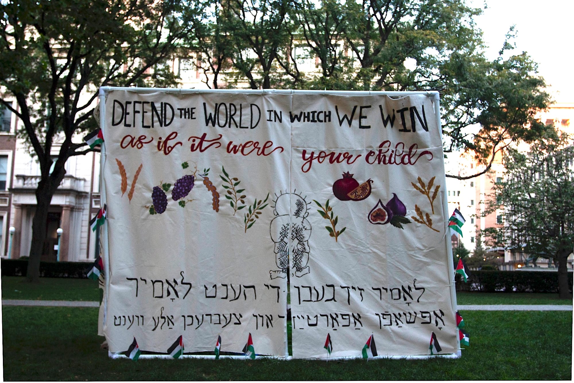 “It’s a line from a prayer we recite daily during the Hashkiveinu,” explained a Columbia student involved in building the sukkah. (Two students interviewed for this piece asked not to be identified for fear of retaliation by university leadership.) “We chose this line because ‘sukkat’ means shelter, the same word for 'sukkah.' It’s a sukkah of peace.”