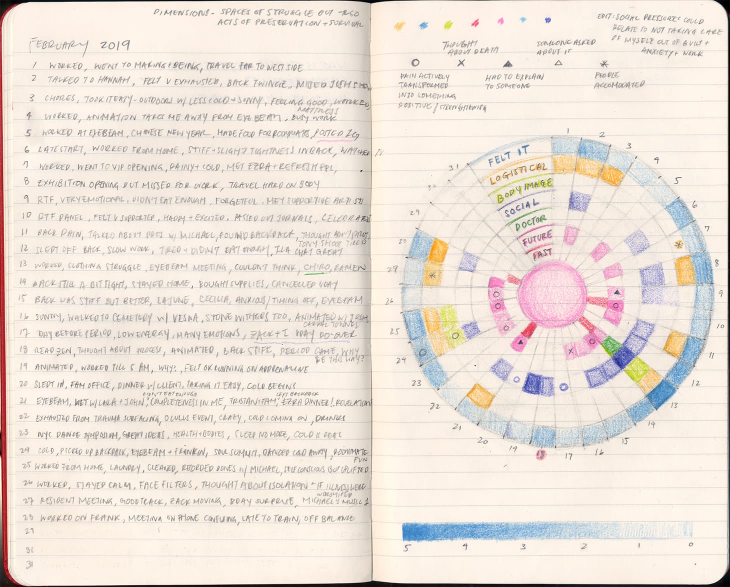 Yoyo Lin was up next, and the first thing she showed me was a notebook, a diary really, that maps her physical and emotional realities over time. She’s trying to work out a system to reclaim chronic health trauma through the creation of an archive of embodied truths around chronic illness and disability. She opened the book to a random page and laid out in front of me was a carefully color coded and shaded circle, divided into the days of the month, depicting how Lin felt, in every dimension, throughout the 30 day period. She used colored and graphite pencils, and the delicate shading reflects not only an acute color sense, but also changes in moods and levels of pain or well-being. This daily data tracking exercise is an attempt to reveal and re-value the experience of chronic illness. And she’s not only journaling her own shifts, but is also doing some exciting movement research where she is inventing a practice with others working with various chronic conditions or disabilities. In fact, Lin played a video for me of a performance which was accompanied by a soundtrack mixed from the actual sounds her body makes — the bones and ligaments stretching and in friction with one another. Her body makes this music and it moves like poetry, and through her experiments in tracking those sounds, and shifts and movements, she is working on turning the stigma of chronic illness upside down, where her body and others’ can be a place of being rather than a site of pain or trauma.