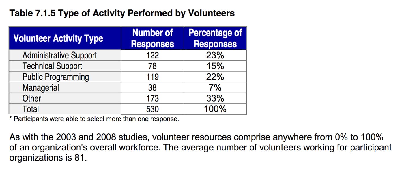 “For example, 73% of organizations with operating budgets under $1,000,000 offer flexible work arrangements,” said the study. “This issue remains significant in an industry where the vast majority of organizations have operating budgets under $1,000,000.” This study was first performed in 2003, due to a growing sense of urgency in the not-for-profit arts sector, as a generation of arts managers and leaders were leaving the workforce and “the question of succession loomed large.”
