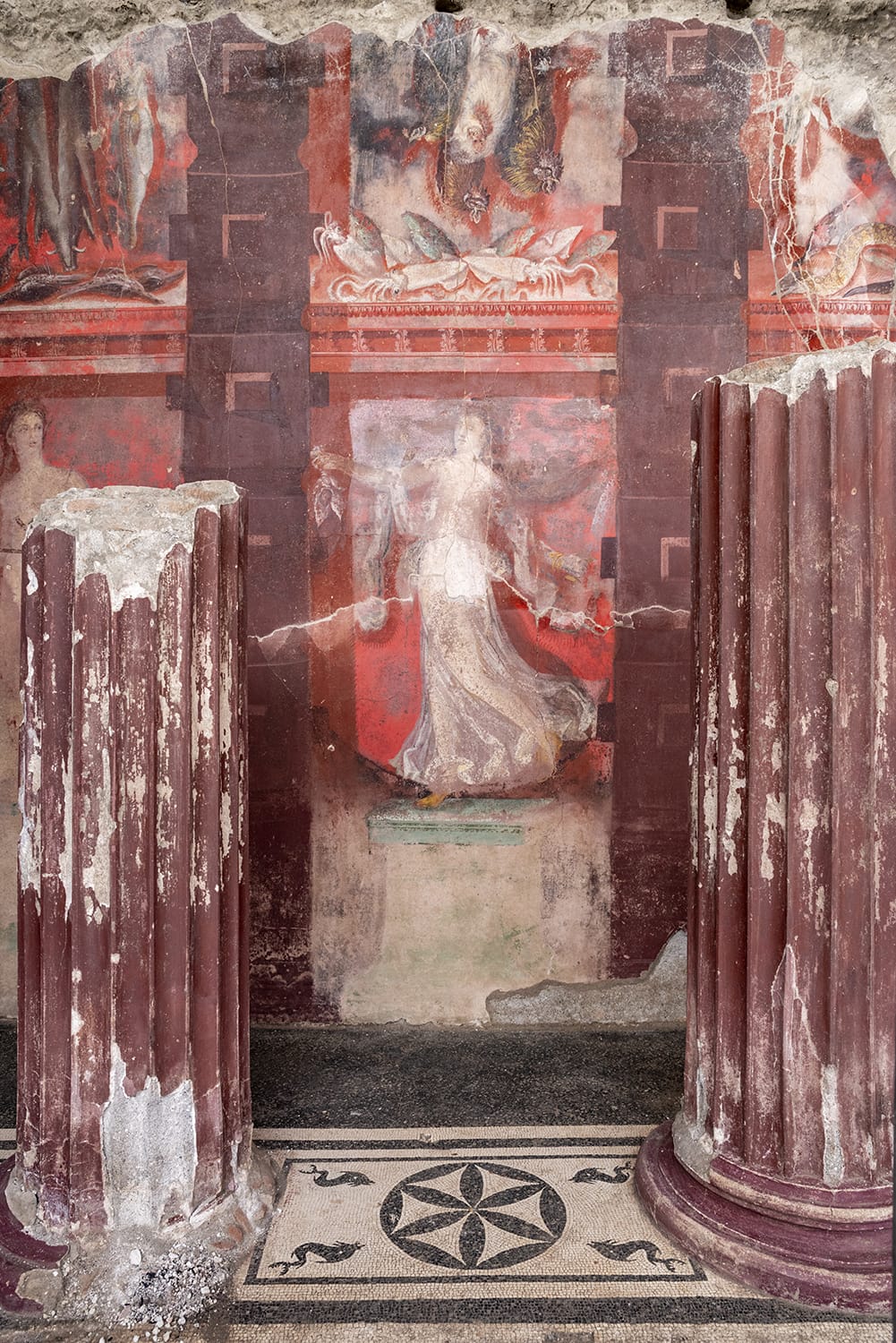 The archaeologists at Pompeii also note that a characteristic element of the fresco is that all the figures stand on painted pedestals, like statues, but are rendered in full color and shaded as though full of life — another bit of evidence in attributing the mural to the Second Style of Pompeiian painting known for its trompe l'œil effect. They also pinpointed the fresco's date to around 40–30 BCE, which would make it already around a century old by the time Mount Vesuvius erupted in 79 CE.