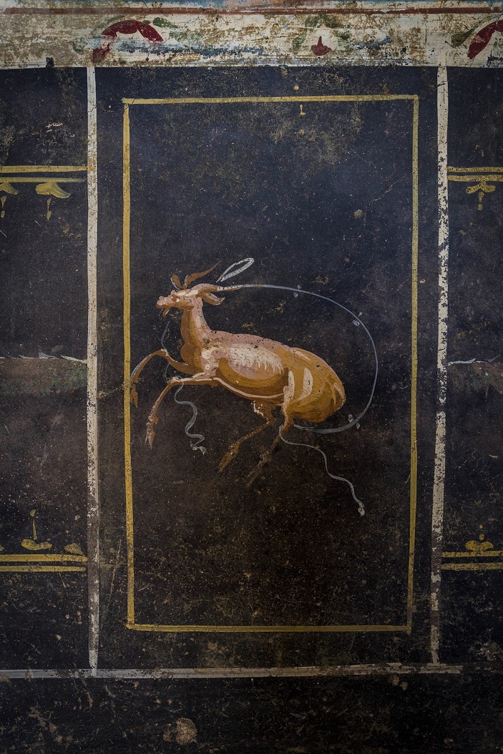 Although the room does not have the same elaborate elements found in other examples of the Fourth Style in Pompeii, such as the frescoes at the House of Meleager, its walls are adorned with depictions of the Horae, goddesses symbolizing the four seasons, plus two allegorical figures representing agriculture and sheep-farming wear lush wreaths and pastel cloaks, according to a detailed report published in the electronic journal on the Excavations of Pompeii Archaeological Park website.