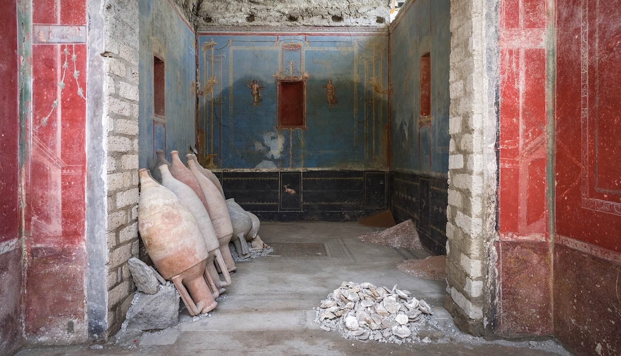 A recently excavated Ancient Roman shrine in Pompeii revealed idyllic blue wall frescoes as well as an ample amount of oyster shells.