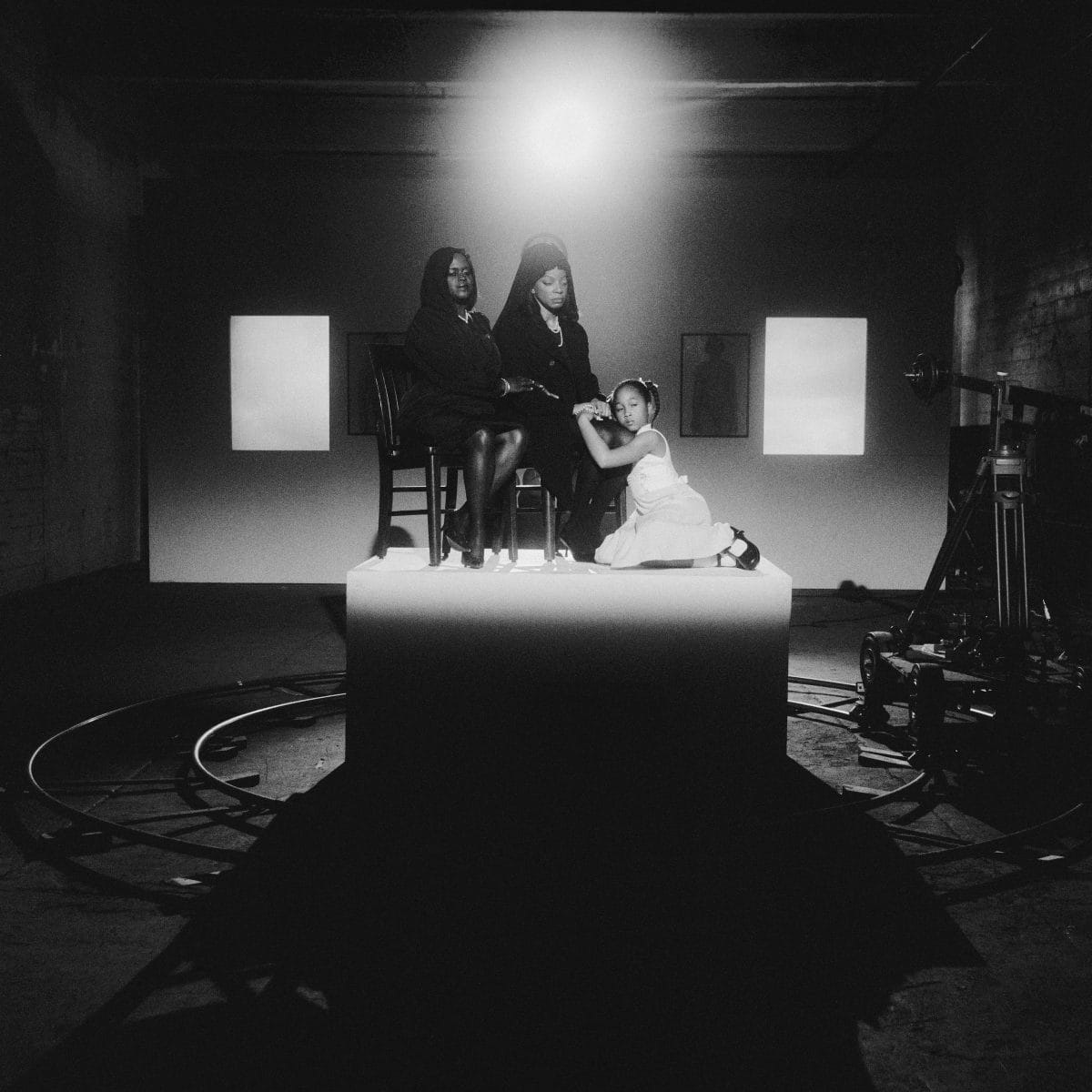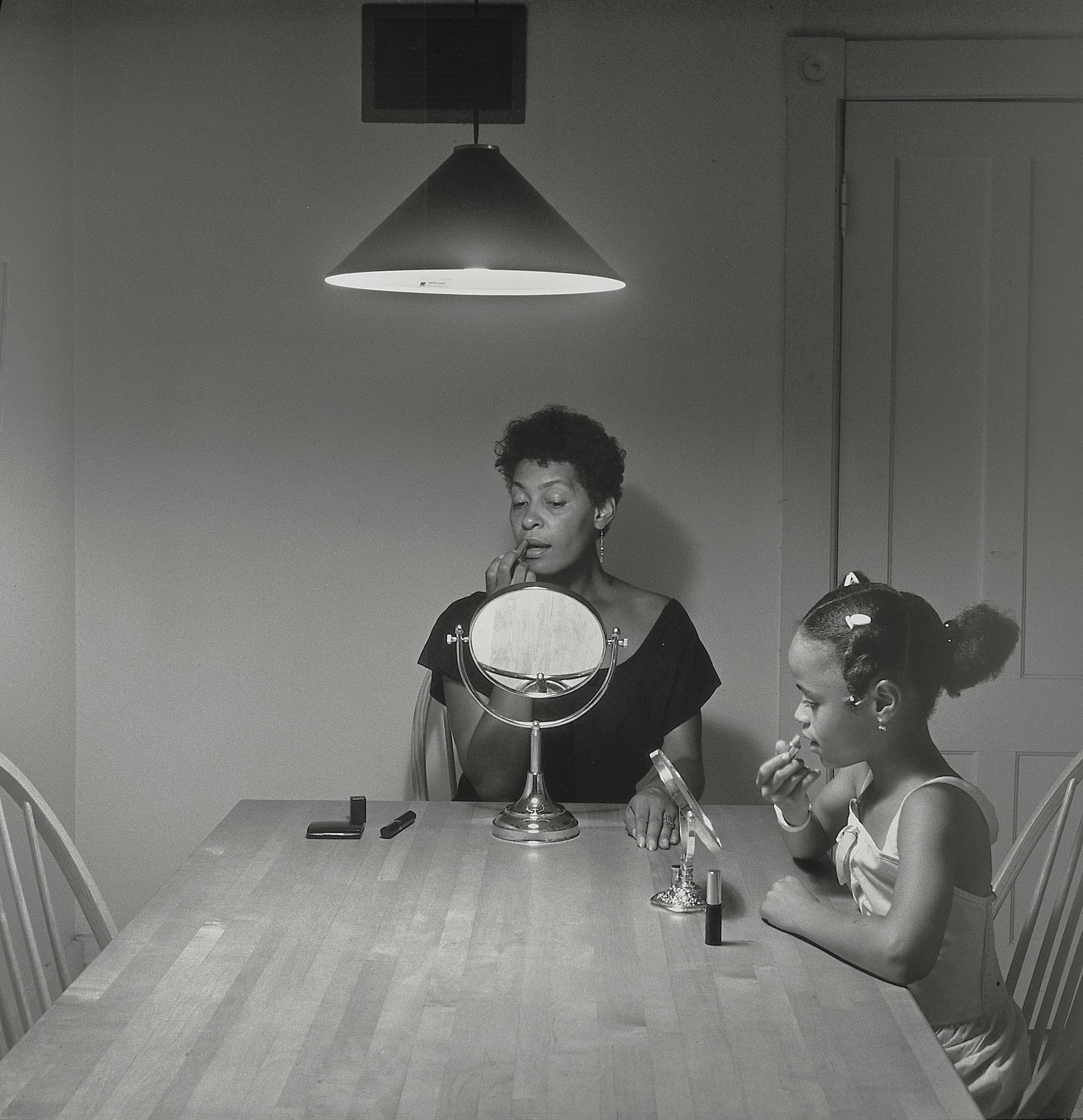 In “Mourning,” a black and white photograph from artist Carrie Mae Weems’s 2008 series Constructing History, two women dressed in black sit next to each other on wooden chairs. Their expressions are solemn. A young child, dressed in a glowing white dress, crouches near on the floor, her arms and head positioned to rest on one of the women’s laps. They sit on a white pedestal. It could be a family portrait, though the scene is made odd by their surroundings. A camera track circles the platform like a mote, while a dolly with a tripod and camera appears to the right, in the middle of capturing the three figures in its slow 360-degree orbit. We’ve stumbled upon a set, one that mixes performance and longing, fact and fiction, in ways that deconstruct the stories we tell about ourselves.