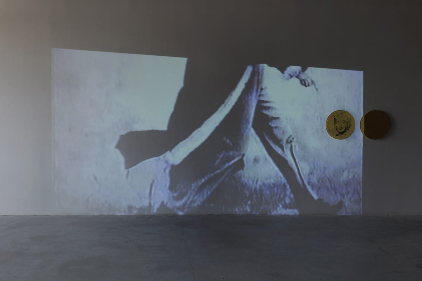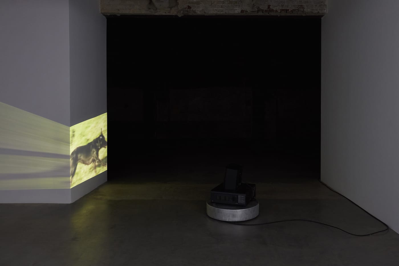 For the video “Dillinger Running Series Compilation” (2000), images of Sturtevant dressed as the gangster John Dillinger are projected, with an accompanying soundtrack, from a rotating base across the walls of the gallery’s darkened first floor, where her replications “Warhol Gold Marilyn” (1973/2004), “Stella Kingsbury Run (Second Version)” (1989), and two Johns light bulbs in bronze (1987) along with their plaster casts (1968 and 1987) are installed. Another video, “Re-Run” (2007), produced jointly by Sturtevant and Muzzey, depicts a running dog (also projected from a rotating base) across the various surfaces of an expansive gallery space. Sometimes elongated, sometimes compacted, sometimes darker, sometimes lighter, each frame of the looped video produces a unique image.