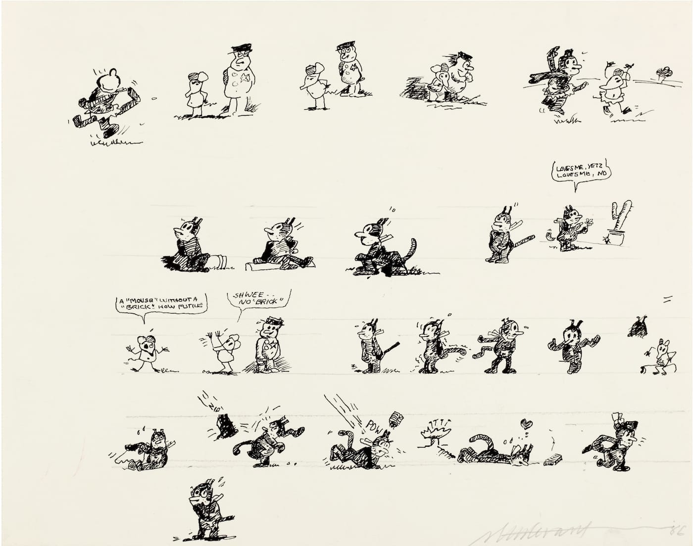 The exhibition is the artist’s third at Gavin Brown’s Enterprise, the second since her death in 2014 (previous shows were in 2012 and 2016, the latter held at Gavin Brown’s outpost in Rome). Organized by the gallery and Sturtevant’s daughter Loren Muzzey, it includes works based on Warhol, Johns, Frank Stella, Felix Gonzales-Torres, and George Herriman’s Krazy Kat cartoons, along with video pieces produced by Sturtevant herself and with Muzzey.