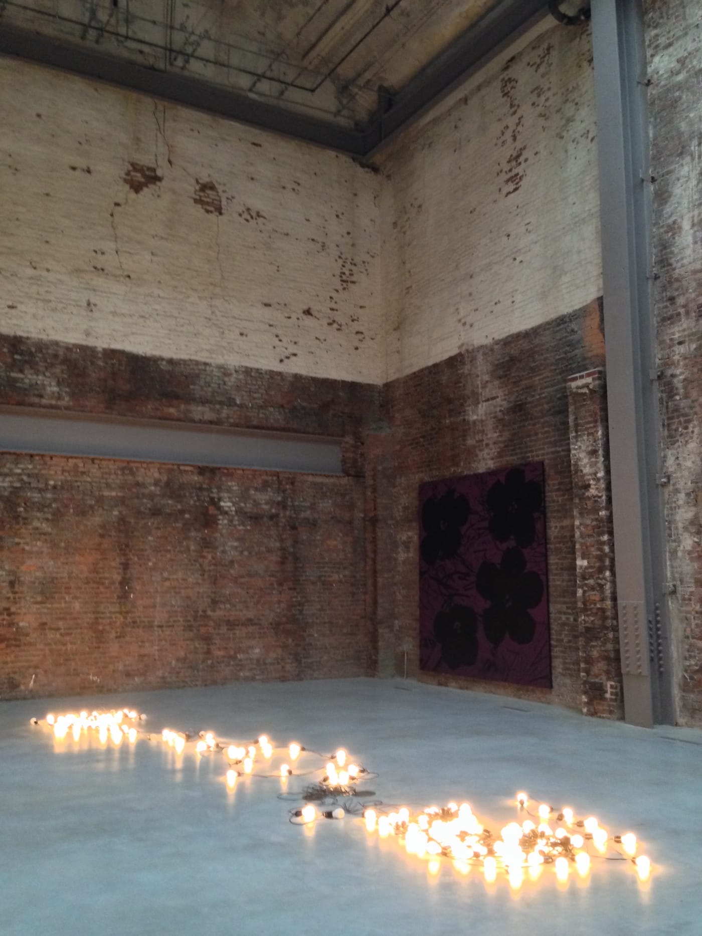 In a stunning, loft-like space on the gallery’s top floor, with exposed brick and skylights, a lone, 120 by 120-inch Warhol flower print, in maroon and black, accompanies strings of illuminated light bulbs loosely scattered across the floor. Were “Warhol Flowers” (1990) and “Gonzales-Torres Untitled (America)” (2004) actually by Warhol and Gonzales-Torres, the juxtaposition might speak to such issues as gay rights, on one hand, and artifice versus authenticity on the other — the former uniting the works via the artists’ sexuality, and the latter disuniting them via their motivations. Traces of these issues are retained in the pairing of these two artists, yet Sturtevant’s gesture creates additional layers of difference — between the original and recreated artworks and between one straight female and two gay male artists, whose personas have been identified with countercultural otherness.