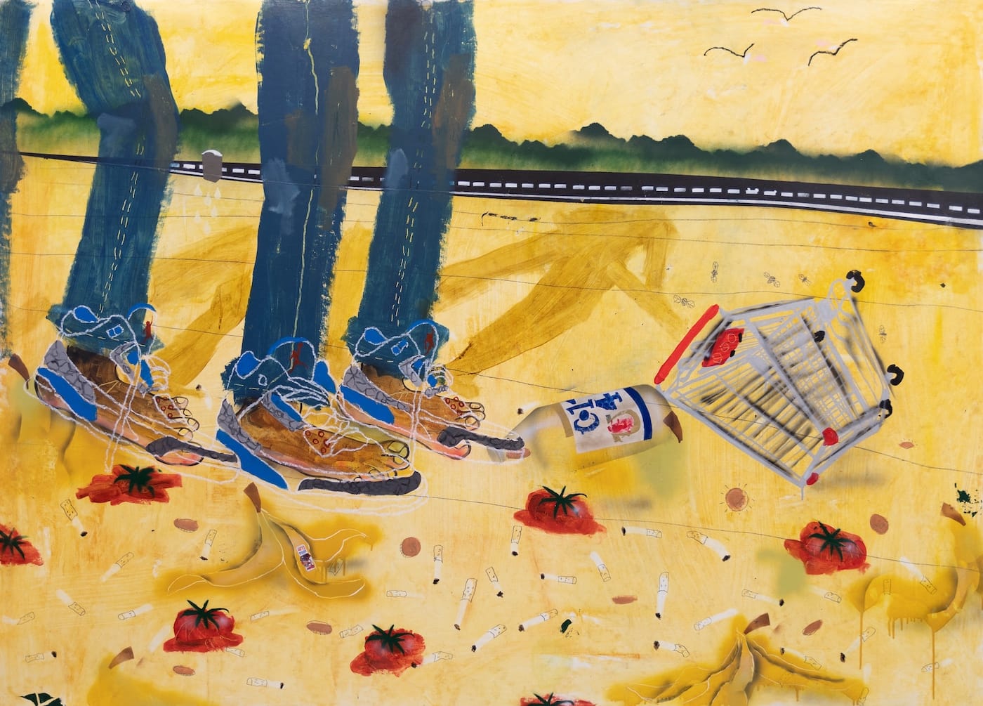 But then you look again, and the sunny yellows turn rank, like grease in the searing heat. The perspective becomes vertiginous. The stylistic shifts within a single painting — from spray-painted shadows to penciled-in cigarette butts to roughly brushed blue jeans with sgraffito seams (“In the Desert They Don’t Remember Your Name,” 2018) — feel just this side of chaotic.
