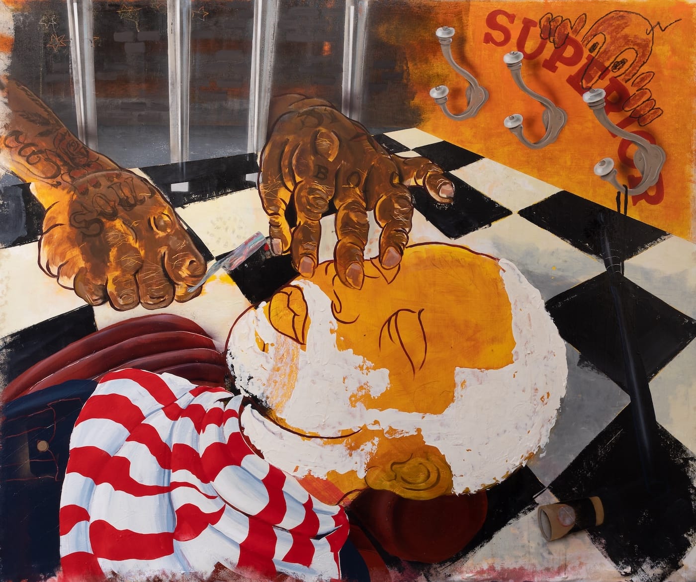 The tin of pomade — gripped by a hand thrusting forward from the canvas’s left edge, just above the boots — here doubles as a tin of shoe polish, with only the word “Superior” visible. Phillips parodies the image on the pomade lid by painting a trio of African Americans (man, woman, and child) with featureless white faces save for their smiling, lipstick-red lips.