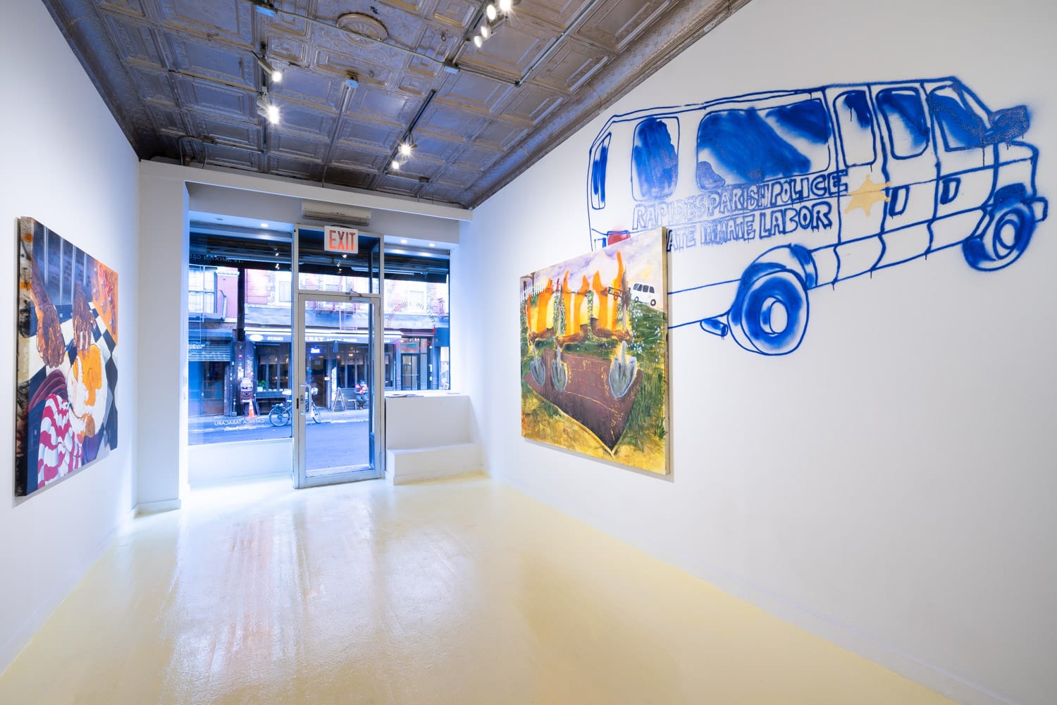 These hierarchies are made palpable in the gallery’s back room, where an actual (non-functioning) industrial outhouse is jammed into a corner, signifying the division between homeowners and the workers who aren’t allowed to use the bathrooms of the houses they’re fixing. (The same outhouses appear in the background of “DIGGERS / The Procession,” towed by a white prison van identified only by the gold sheriff’s star on its side.)