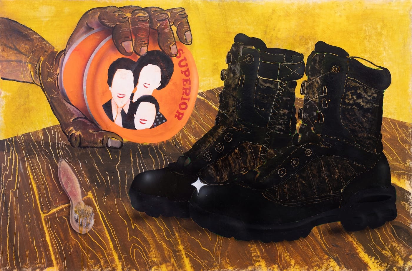 The absence of an encumbering context frees the iconographic details (heightened by the shifting styles, which serve to isolate and individuate them) to generate open-ended implications and push into wider arenas. You don’t need to know that the gleaming, jet-black boots in “SUPERIOR” (2018) belong to a prison guard to discern the discomfiting power dynamics at play in the work. Nor do you need to know that the title of the painting derives from Murray’s Superior Hair Dressing Pomade, a product tailored to the African American market since the 192os, to apprehend the racial complexities that Phillips has built into the image.
