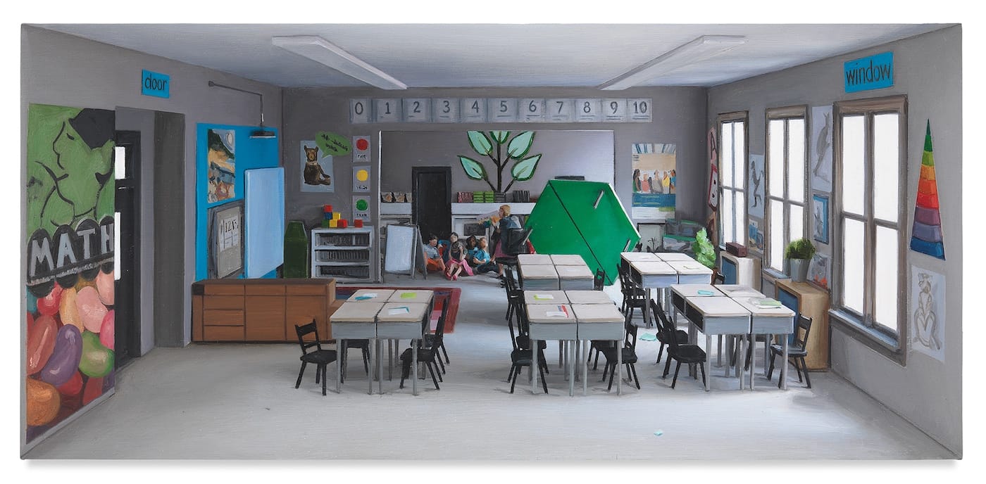 In “Drills” (2018), which is more than twice as long as it is high, Bennett depicts an elementary school classroom as a deep, box-like space, where the students huddle together at the back of the room, while a teacher, who is seated on a desk chair and holding an illustrated book, appears to be reading to them. Just to her right, a large, green hexagonal table has been upended; lying on one edge, it becomes a kind of shield. Doesn’t the painting’s title, “Drills,” invite us to read the scene in light of the Sandy Hook Elementary School shooting in 2012, and the drills that students now routinely practice in case an “active shooter” has entered the school?