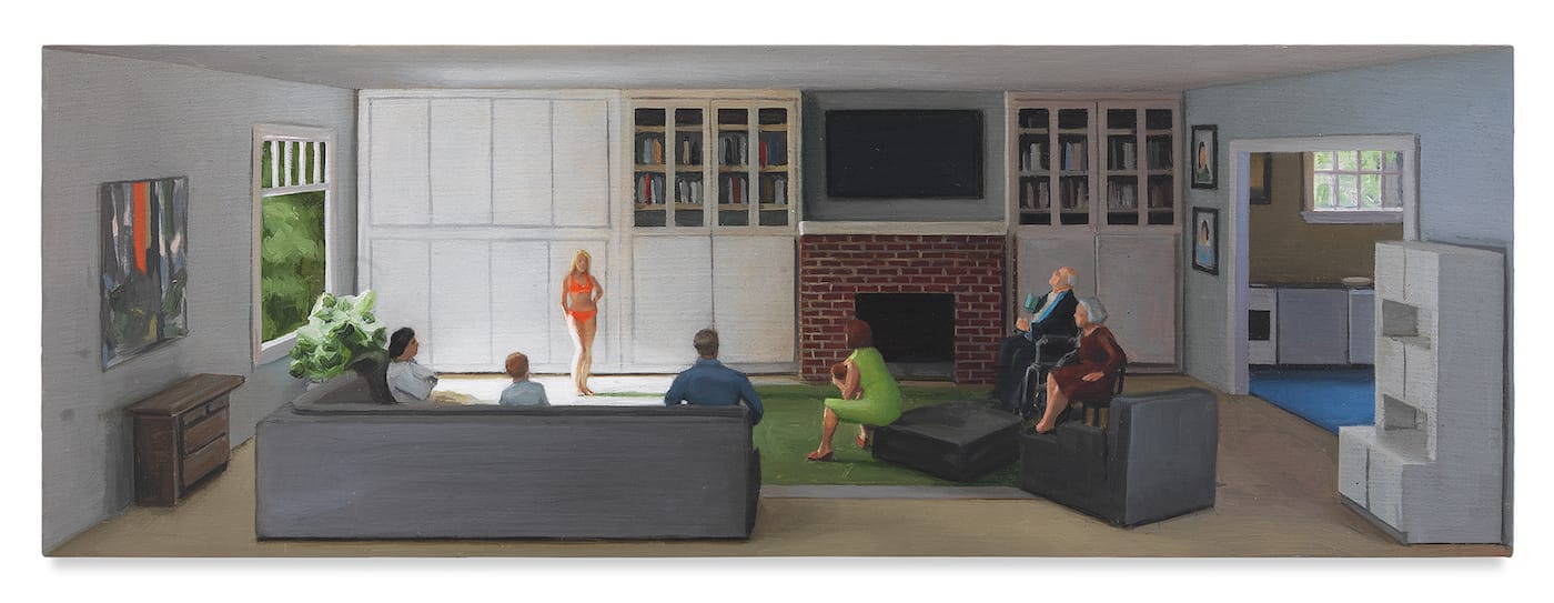 No matter how ordinary some of Bennett’s scenes initially appear, it is soon apparent that she is in touch with the fears affecting everyday suburban lives. In “Fashion Show” (2018), a blonde teenage girl wearing an orange bathing suit poses in a suburban living room, while six people – one of whom is holding a baby – sit looking at her. What the heck is going on? Is this a family objectifying its offspring or, in the case of the older adults on the far right, their grandchild? There is something undeniably creepy underway, which Bennett is able to transfer to us. Are we joining the people in the room gazing at the girl? Or are we looking at them looking at her?