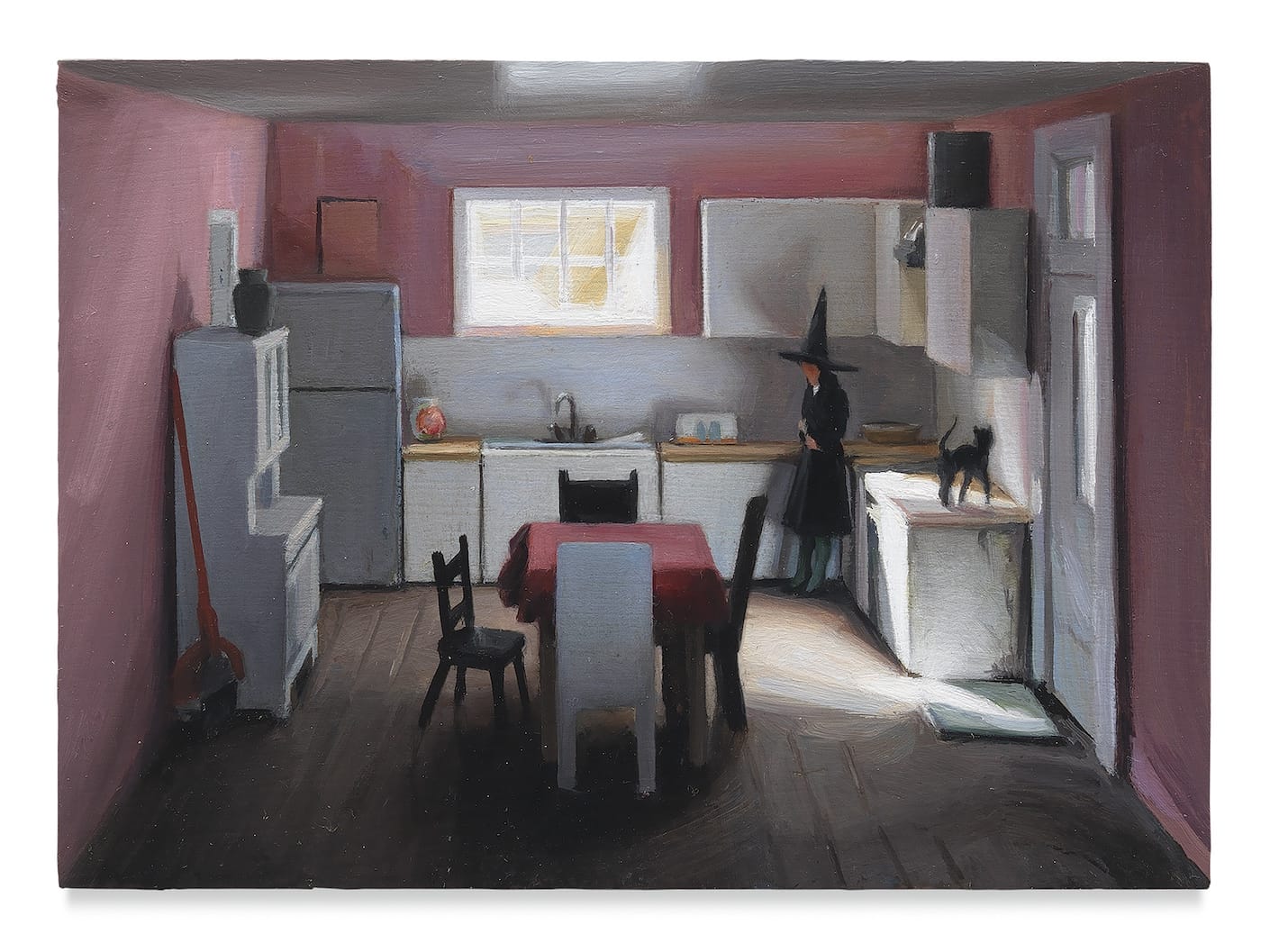 In “Witch” (2019), we see a woman in a black coat and a wide-brimmed, conical hat standing in her kitchen, in the right-hand corner, where the overhead cabinets hang above the counters. A black cat stands on the edge of the counter, its back arched, looking at her. The kitchen walls are a dusty grayish-pink. The light coming in through the window, which is set on the far wall above the sink, falls on the floor and counter, cutting the witch off from the rest of the room.