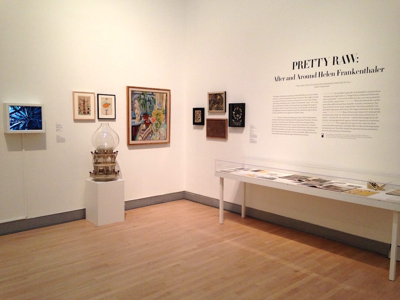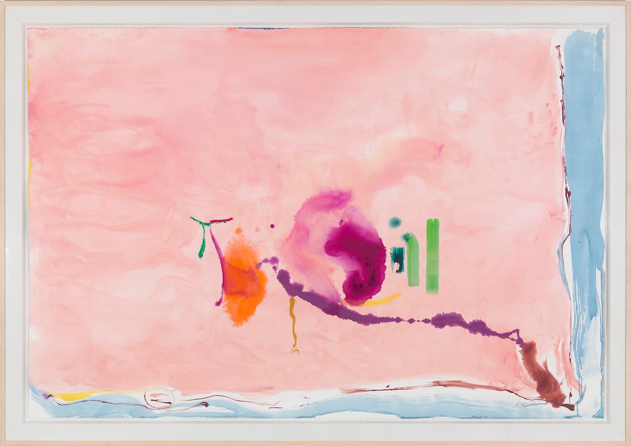 By contrast, Pretty Raw positions Frankenthaler as central to an alternative account of second-generation artists figured as more “feminine,” not only for the contributions of Frankenthaler, Grace Hartigan, Jane Freilicher, and other women, but also for the gay artists who presented a counterpoint to the previous generation’s macho posturing. (Although not part of this exhibition, Jasper Johns’s 1960 “Painting with Two Balls” is relevant, given his recollection to David Bourdon regarding its direct dig at Abstract Expressionist enthusiasm for “ballsy” painting.) Here Frankenthaler is one of a group of artists associated with the Tibor de Nagy Gallery, where an embrace of a younger generation of painters was intermixed with what Frankenthaler described in a 1968 interview with Barbara Rose as a “wild camp” aesthetic — an inclusive approach that is signaled at the opening of Pretty Raw by an eclectic grouping of objects, drawings, and ephemera.
