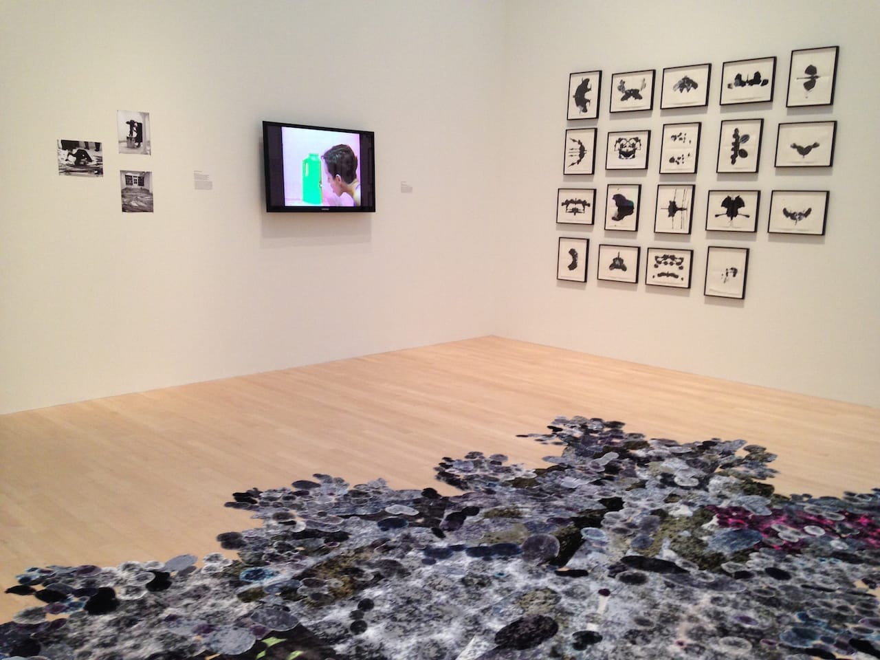 At various points the arrangement of the exhibition encourages an interplay between viewers’ spatial awareness and perception of the artists’ embodied gestures: oblique connections are established, for example, by the proximity of a floor piece by Polly Apfelbaum (“Blue Haired Nirvana,” 1997), photographs of Janine Antoni painting the floor with hair dye for her 1993 “Loving Care,” Cheryl Donegan’s 1993 video Head, with its suggestive play with a stream of milk, and Kara Walker’s unexpected response to Rorschach patterns in a 1995 series of untitled ink and pencil drawings. The body is also evoked in the “Men’s Room” section of the exhibition (entered through a Felix Gonzalez-Torres beaded curtain) by Carroll Dunham’s cartoon-like rendering of phallic forms (“Shape with Points,” 1989-90) or the urination process Andy Warhol employed for his 1978 “Oxidation Paintings” – even as gender identifications are complicated by “BC (4646),” Sterling Ruby’s 2013 quilt-inspired painting.